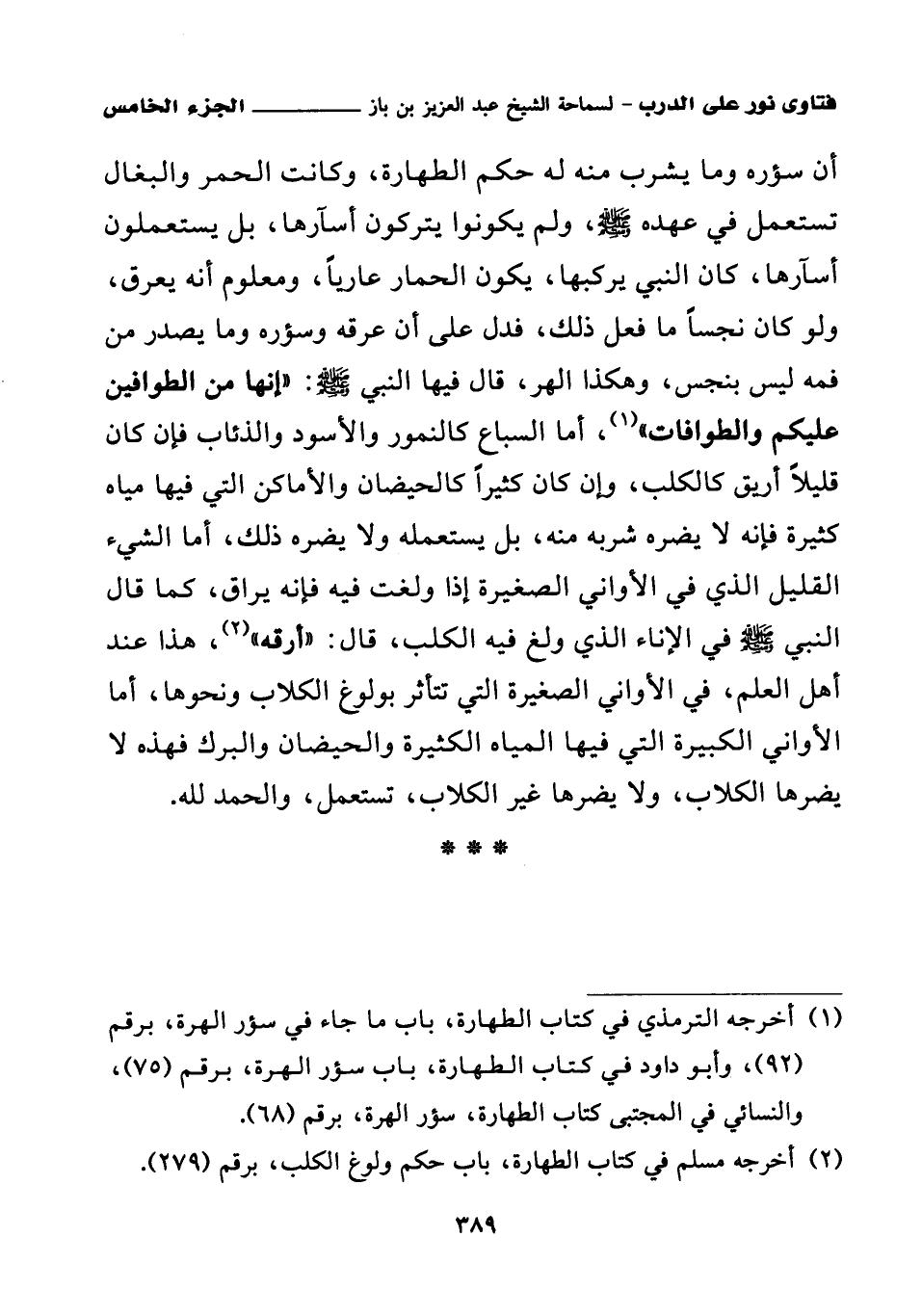 أن سؤره وما يشرب منه له حكم الطهارة، وكانت الحمر والبغال تستعمل في عهده صلى الله عليه وسلم، ولم يكونوا يتركون أسآرها، بل يستعملون أسآرها، كان النبي يركبها، يكون الحمار عاريا، ومعلوم أنه يعرق، ولو كان نجسا ما فعل ذلك، فدل على أن عرقه وسؤره وما يصدر من فمه ليس بنجس، وهكذا الهر، قال فيها النبي صلى الله عليه وسلم: «إنها من الطوافين عليكم والطوافات (¬1)» أما السباع كالنمور والأسود والذئاب فإن كان قليلا أريق كالكلب، وإن كان كثيرا كالحيضان والأماكن التي فيها مياه كثيرة فإنه لا يضره شربه منه، بل يستعمله ولا يضره ذلك، أما الشيء القليل الذي في الأواني الصغيرة إذا ولغت فيه فإنه يراق، كما قال النبي صلى الله عليه وسلم في الإناء الذي ولغ فيه الكلب، قال: «أرقه (¬2)» هذا عند أهل العلم، في الأواني الصغيرة التي تتأثر بولوغ الكلاب ونحوها، أما الأواني الكبيرة التي فيها المياه الكثيرة والحيضان والبرك فهذه لا يضرها الكلاب، ولا يضرها غير الكلاب، تستعمل، والحمد لله.