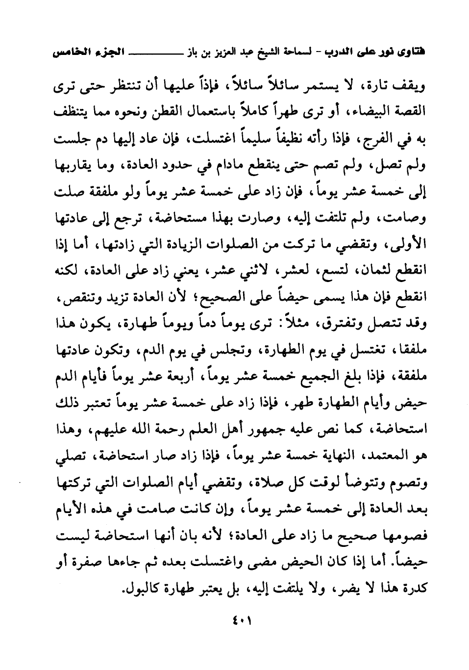 ويقف تارة، لا يستمر سائلا سائلا، فإذا عليها أن تنتطر حتى ترى القصة البيضاء، أو ترى طهرا كاملا باستعمال القطن ونحوه مما يتنظف به في الفرج، فإذا رأته نظيفا سليما اغتسلت، فإن عاد إليها دم جلست ولم تصل، ولم تصم حتى ينقطع ما دام في حدود العادة، وما يقاربها إلى خمسة عشر يوما، فإن زاد على خمسة عشر يوما ولو ملفقة صلت وصامت، ولم تلتفت إليه، وصارت بهذا مستحاضة، ترجع إلى عادتها الأولى، وتقضي ما تركت من الصلوات الزيادة التي زادتها، أما إذا انقطع لثمان، لتسع، لعشر، لاثني عشر، يعني زاد على العادة، لكنه انقطع فإن هذا يسمى حيضا على الصحيح؛ لأن العادة تزيد وتنقص، وقد تتصل وتفترق، مثلا: ترى يوما دما ويوما طهارة، يكون هذا ملفقا، تغتسل في يوم الطهارة، وتجلس في يوم الدم، وتكون عادتها ملفقة، فإذا بلغ الجميع خمسة عشر يوما، أربعة عشر يوما فأيام الدم حيض وأيام الطهارة طهر، فإذا زاد على خمسة عشر يوما تعتبر ذلك استحاضة، كما نص عليه جمهور أهل العلم رحمة الله عليهم، وهذا هو المعتمد، النهاية خمسة عشر يوما، فإذا زاد صار استحاضة، تصلي وتصوم وتتوضأ لوقت كل صلاة، وتقضي أيام الصلوات التي تركتها بعد العادة إلى خمسة عشر يوما، وإن كانت صامت في هذه الأيام فصومها صحيح ما زاد على العادة؛ لأنه بان أنها استحاضة ليست حيضا. أما إذا كان الحيض مضى واغتسلت بعده ثم جاءها صفرة أو كدرة هذا لا يضر، ولا يلتفت إليه، بل يعتبر طهارة كالبول.