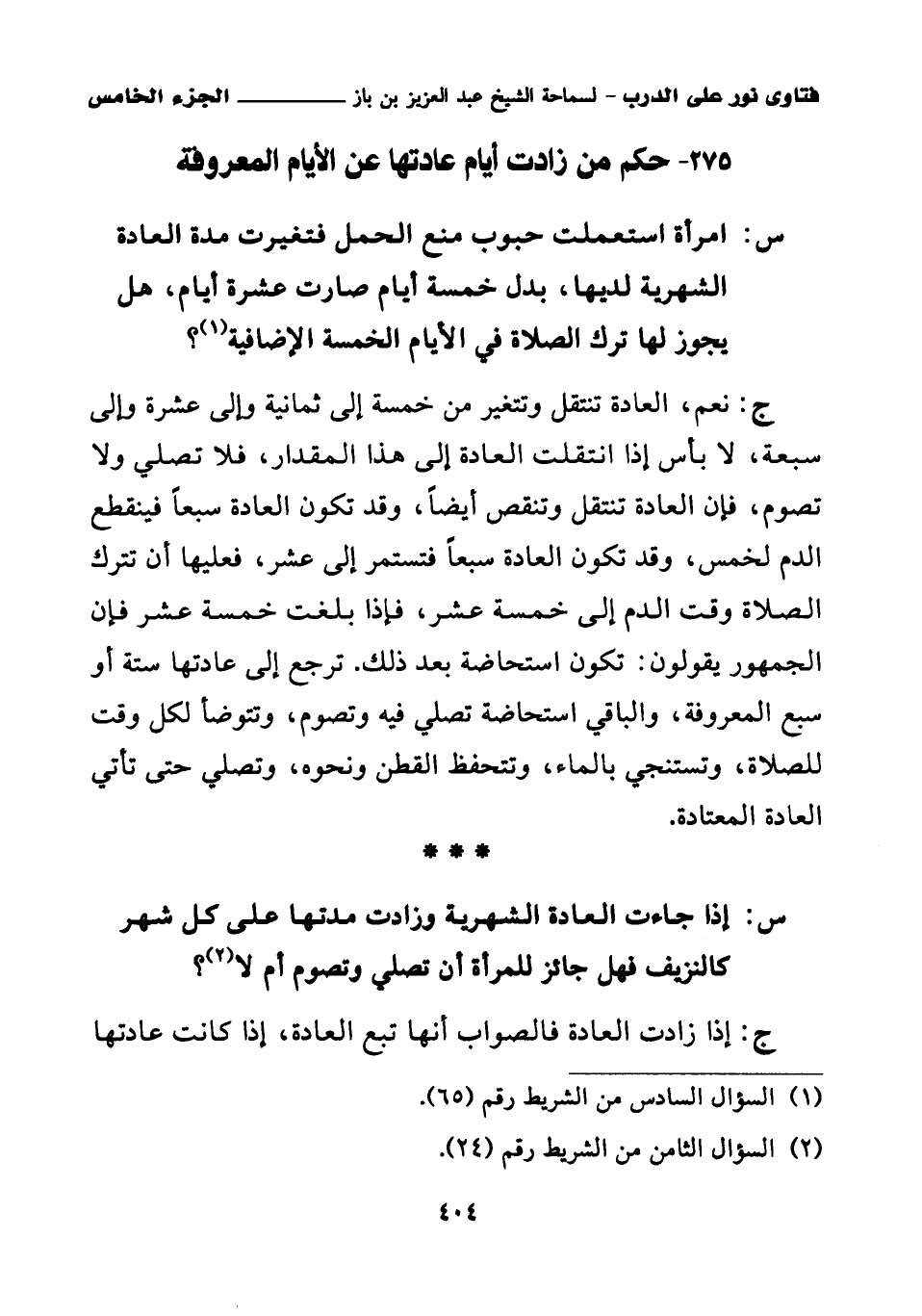 275 - حكم من زادت أيام عادتها عن الأيام المعروفة