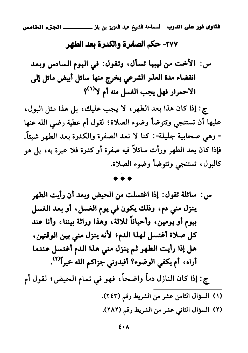 س: الأخت من ليبيا تسأل، وتقول: في اليوم السادس وبعد انقضاء مدة العذر الشرعي يخرج منها سائل أبيض مائل إلى الاحمرار فهل يجب الغسل منه أم لا (¬1)؟