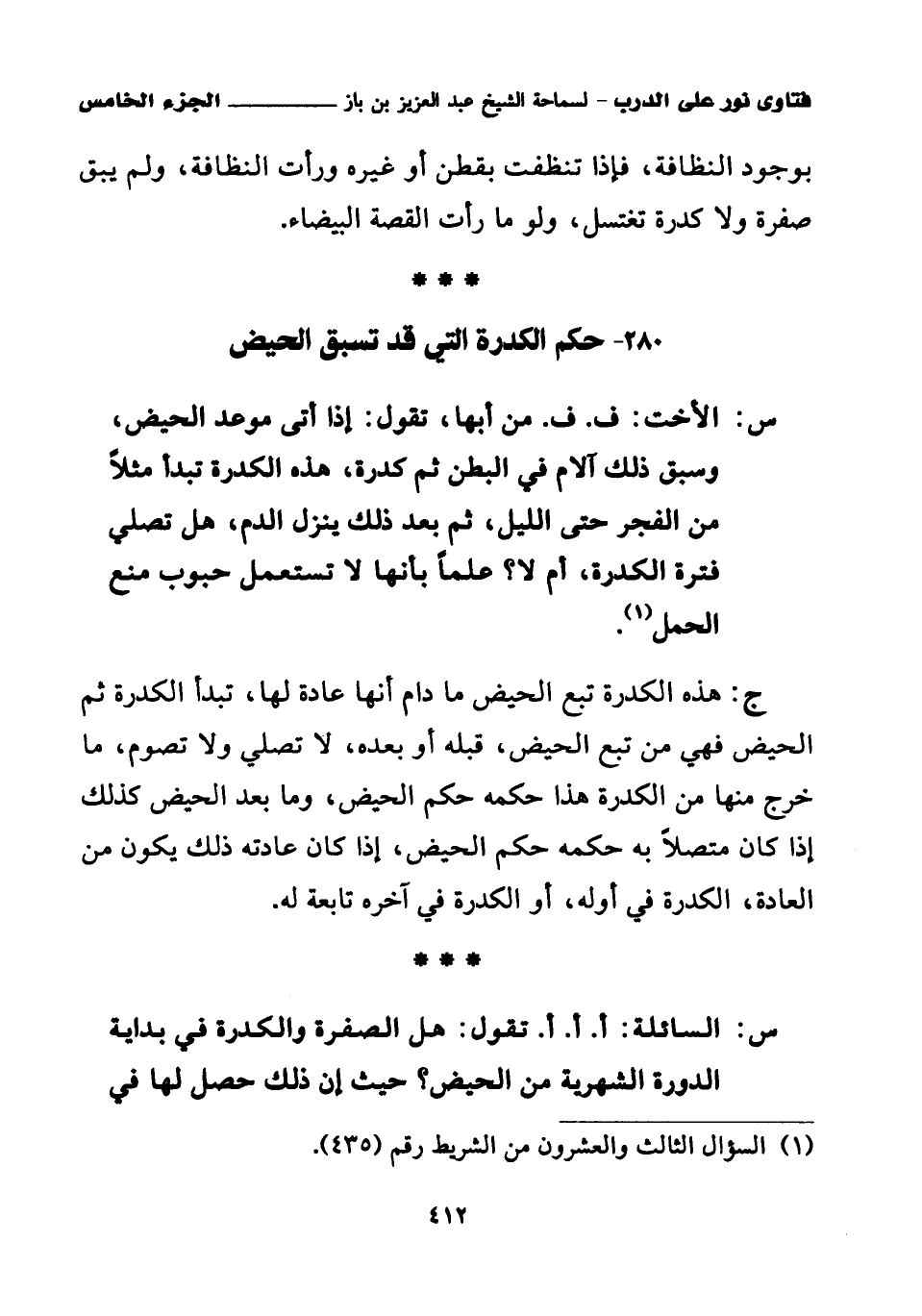 ج: هذه الكدرة تبع الحيض ما دام أنها عادة لها، تبدأ الكدرة ثم الحيض فهي من تبع الحيض، قبله أو بعده، لا تصلي ولا تصوم، ما خرج منها من الكدرة هذا حكمه حكم الحيض، وما بعد الحيض كذلك إذا كان متصلا به حكمه حكم الحيض، إذا كان عادته ذلك يكون من العادة، الكدرة في أوله، أو الكدرة في آخره تابعة له.