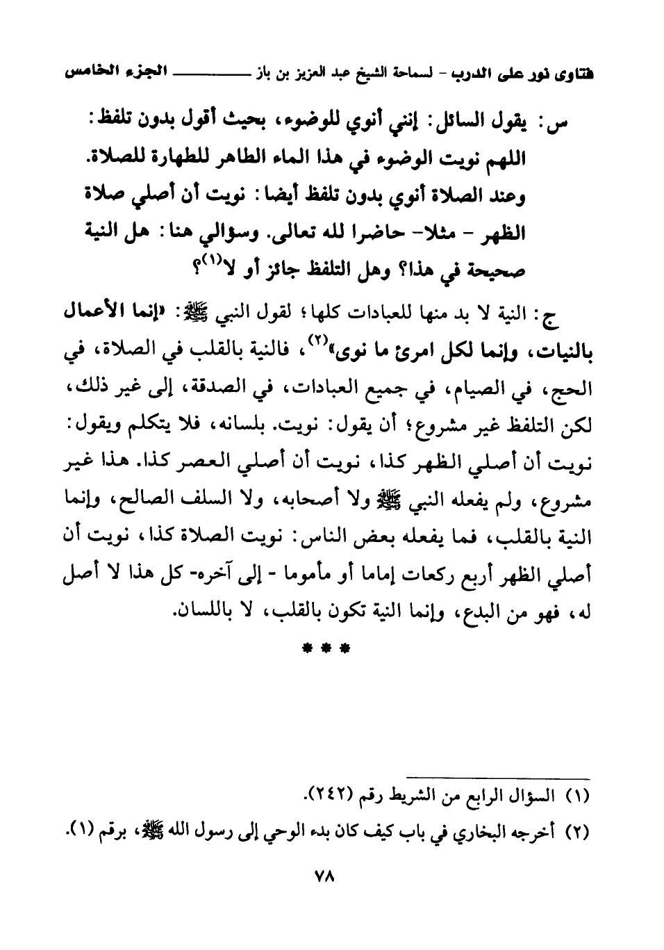 ج: النية لا بد منها للعبادات كلها؛ لقول النبي صلى الله عليه وسلم: «إنما الأعمال بالنيات، وإنما لكل امرئ ما نوى (¬2)» فالنية بالقلب في الصلاة، في الحج، في الصيام، في جميع العبادات، في الصدقة، إلى غير ذلك، لكن التلفظ غير مشروع؛ أن يقول: نويت بلسانه، فلا يتكلم ويقول: نويت أن أصلي الظهر كذا، نويت أن أصلي العصر كذا , هذا غير مشروع، ولم يفعله النبي صلى الله عليه وسلم ولا أصحابه، ولا السلف الصالح، وإنما النية بالقلب، فما يفعله بعض الناس: نويت الصلاة كذا، نويت أن أصلي الظهر أربع ركعات إماما أو مأموما – إلى آخره – كل هذا لا أصل له، فهو من البدع، وإنما النية تكون بالقلب، لا باللسان.