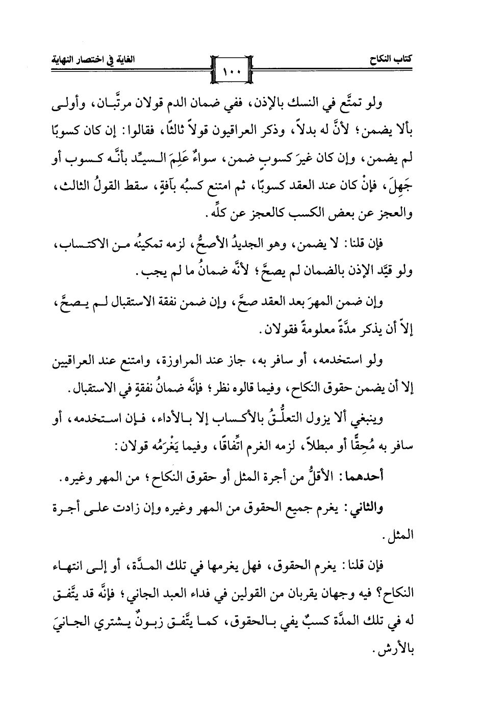 ولو تمتَّع في النسك بالإذن، ففي ضمان الدم قولان مرتَّبان، وأولى بألا يضمن؛ لأنَّ له بدلًا، وذكر العراقيون قولًا ثالثًا، فقالوا: إن كان كسوبًا لم يضمن، وإن كان غيرَ كسوبٍ ضمن، سواءٌ عَلِمَ السيِّد بأنَّه كسوب أو جَهِلَ، فإنْ كان عند العقد كسوبًا، ثم امتنع كسبُه بآفةٍ، سقط القولُ الثالث، والعجز عن بعض الكسب كالعجز عن كلِّه.
