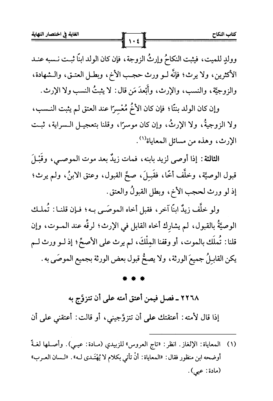 وولدٍ للميت، فيثبت النكاحُ وإرثُ الزوجة، فإن كان الولد ابنًا ثبت نسبه عند الأكثرين، ولا يرث؛ فإنَّه لو ورث حجب الأخ، وبطل العتق، والشهادة، والزوجيَّة، والنسب، والإرث، وأَبْعدَ مَن قال: لا يثبتُ النسب ولا الإرث.