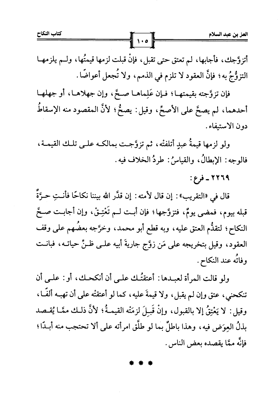 ولو قالت المرأة لعبدها: أعتقتُك على أن أنكحك، أو: على أن تنكحني، عتق وإن لم يقبل، ولا قيمةَ عليه، كما لو أعتقتْه على أن تهبه ألفًا، وقيل: لا يَعْتِقُ إلا بالقبول، وإنْ قَبِلَ لزمَتْه القيمةُ؛ لأنَّ ذلك ممَّا يُقصد بذلُ العِوَض فيه، وهذا باطلٌ بما لو طلَّق امرأته على ألا تحتجب منه أبدًا؛ فإنَّه ممَّا يقصده بعض الناس.