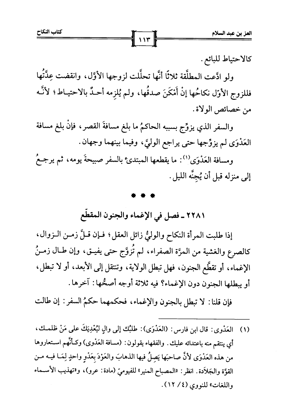 (¬1) العَدْوى: قال ابن فارس: (العَدْوَى): طلبُك إلى والٍ ليُعْدِيَكَ على مَنْ ظلمك، أي ينتقم منه باعتدائه عليك. والفقهاء يقولون: (مسافة العَدْوى) وكأنَّهم استعاروها من هذه العَدْوَى لأنَّ صاحبَها يَصِلُ فيها الذهابَ والعَوْدَ بِعَدْوٍ واحدٍ لِمَا فيه من القوَّة والجَلاَدة. انظر: "المصباح المنير" للفيوميّ (مادة: عرو)، و"تهذيب الأسماء واللغات" للنووي (4/ 12).