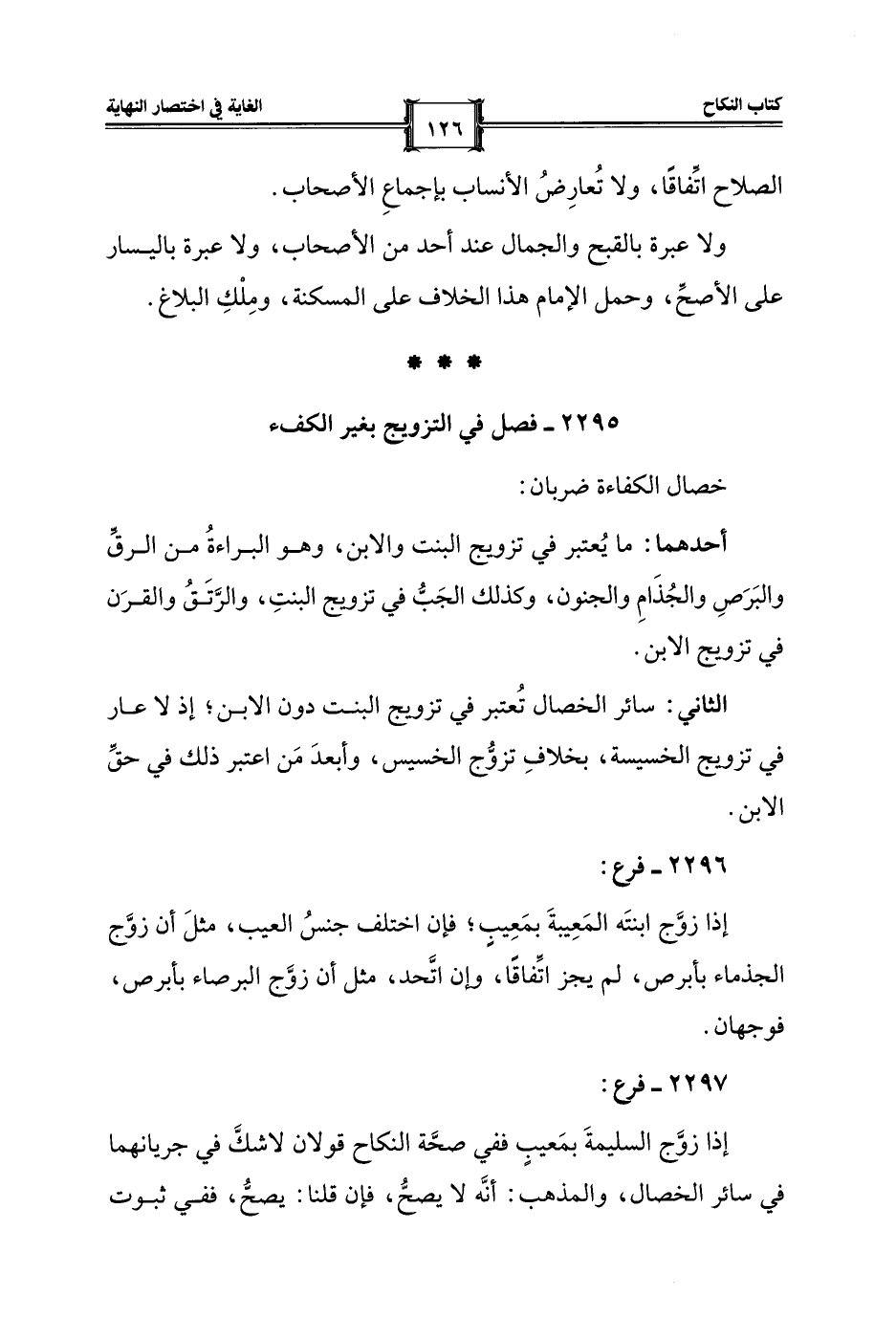 ولا عبرة بالقبح والجمال عند أحد من الأصحاب، ولا عبرة باليسار على الأصحِّ، وحمل الإِمام هذا الخلاف على المسكنة، ومِلْكِ البلاع.