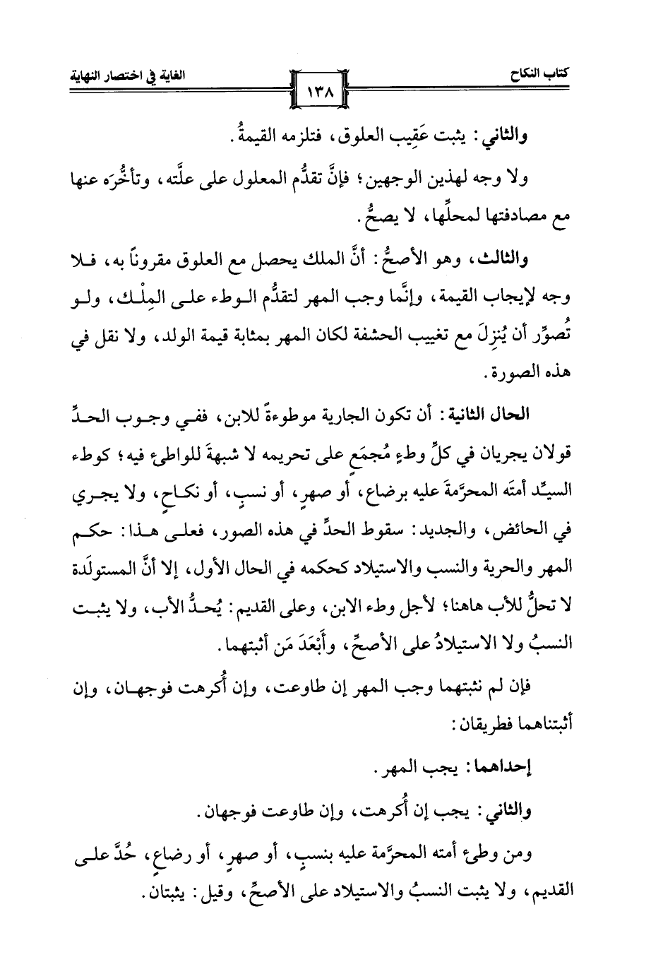 الحال الثانية: أن تكون الجارية موطوءةً للابن، ففي وجوب الحدِّ قولان يجريان في كلِّ وطءٍ مُجمَعٍ على تحريمه لا شبهةَ للواطئ فيه؛ كوطء السيِّد أمتَه المحرَّمةَ عليه برضاع، أو صهرٍ، أو نسبٍ، أو نكاحٍ، ولا يجري في الحائض، والجديد: سقوط الحدِّ في هذه الصور، فعلى هذا: حكم المهر والحرية والنسب والاستيلاد كحكمه في الحال الأول، إلا أنَّ المستولَدة لا تحلُّ للأب هاهنا؛ لأجل وطء الابن، وعلى القديم: يُحدُّ الأب، ولا يثبت النسبُ ولا الاستيلادُ على الأصحِّ، وأَبْعَدَ مَن أثبتهما.