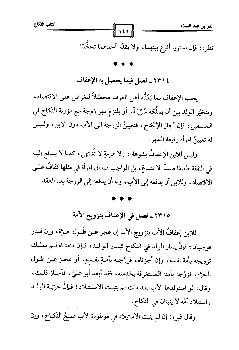يجب الإعفاف بما يَعُدُّه أهل العرف محصِّلًا للغرض على الاقتصاد، ويتخيَّر الولد بين أن يملِّكه سُرِّيِّةً، أو يلتزمَ مهر زوجة مع مؤونة النكاح في المستقبل؛ فإن أجاز الإنكاح، فتعيينُ الزوجة إلى الأب دون الابن، وليس له تعيينُ امرأة رفيعة المهر.