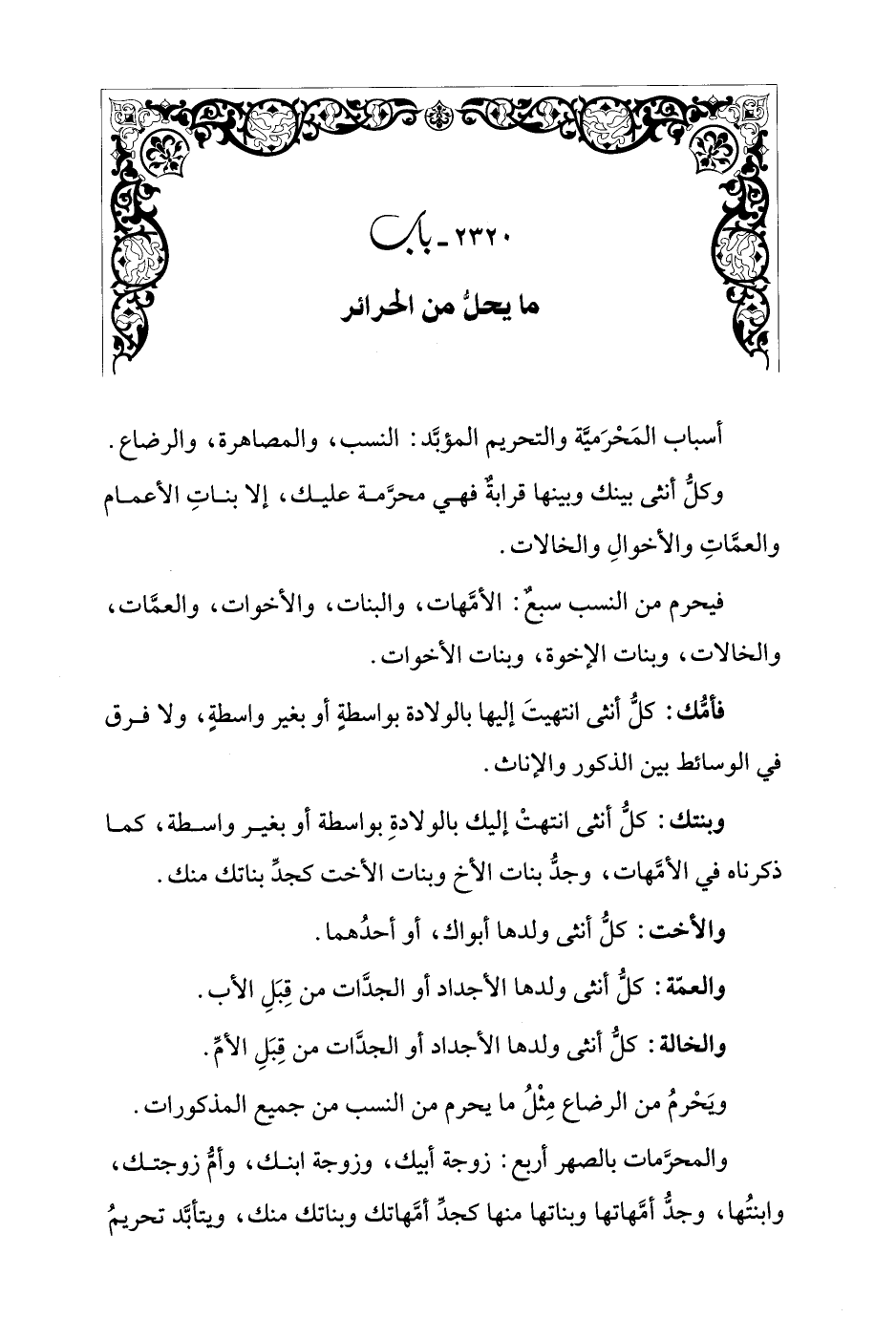وكلُّ أنثى بينك وبينها قرابةٌ فهي محرَّمة عليك، إلا بناتِ الأعمام والعمَّاتِ والأخوالِ والخالات.