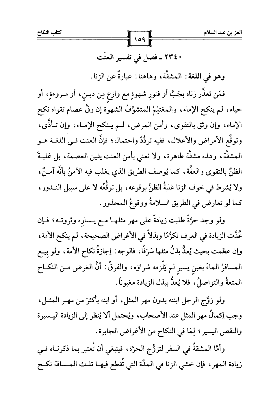 فمَن تعذَّر زناه بجَبٍّ أو فتورِ شهوةٍ مع وازعٍ مِن دينٍ، أو مروءةٍ، أو حياء، لم ينكح الإماء، والمغتلِمُ المتشوِّفُ الشهوة إن رقَّ عصام تقواه نكح الإماء، وإن وثق بالتقوى، وأمن المرض، لم ينكح الإماء، وإن تأذِّى، وتوقَّع الأمراض والأعلال، ففيه تردُّدٌ واحتمال؛ فإنَّ العنت في اللغة هو المشقَّة، وهذه مشقَّة ظاهرة، ولا نعني بأمن العنت يقين العصمة، بل غلبةَ الظنِّ بالتقوى والعفَّة، كما يُوصف الطريق الذي يغلب فيه الأمنُ بأنَّه آمنٌ، ولا يُشرط في خوف الزنا غلبةُ الظنِّ بوقوعه، بل توقُّعُه لا على سبيل الندور، كما لو تعارض في الطريق السلامةُ ووقوعُ المحذور.