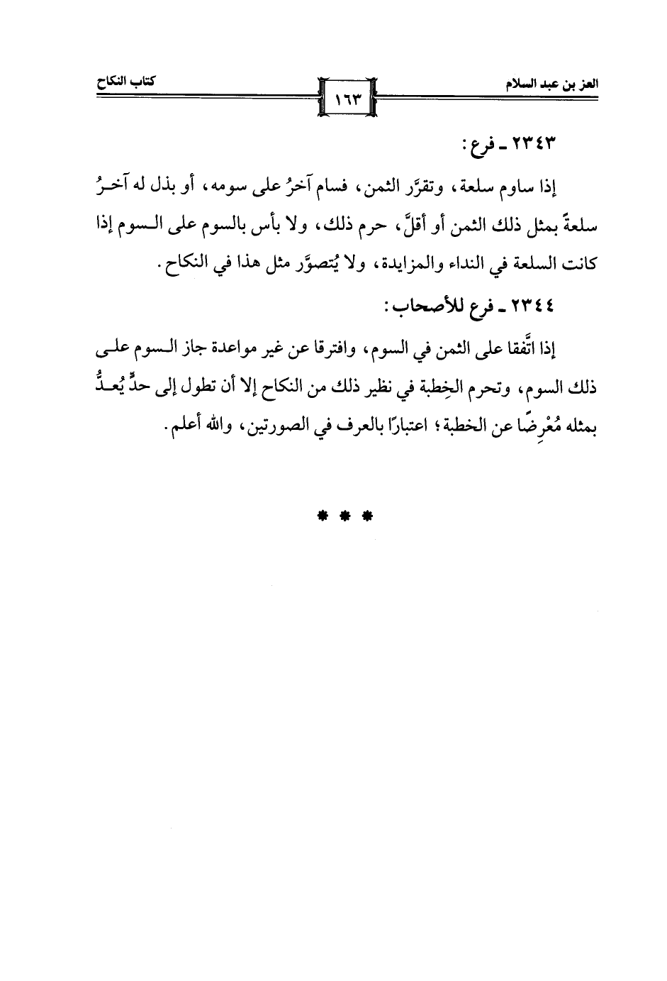 إذا ساوم سلعة، وتقرَّر الثمن، فسام آخرُ على سومه، أو بذل له آخرُ سلعة بمثل ذلك الثمن أو أقلَّ، حرم ذلك، ولا بأس بالسوم على السوم إذا كانت السلعة في النداء والمزايدة، ولا يُتصوَّر مثل هذا في النكاح.