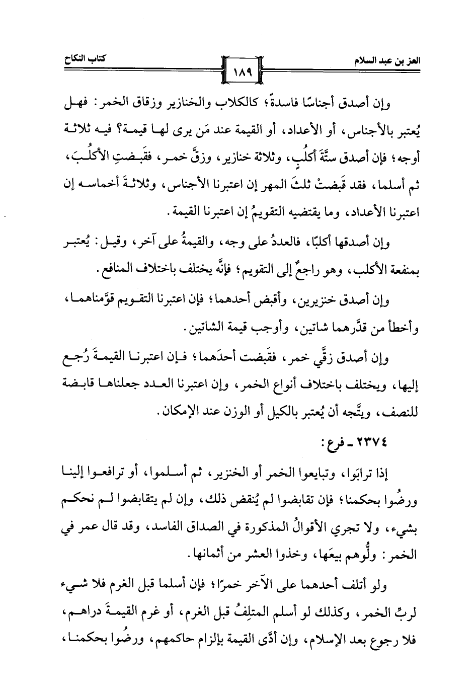 وإن أصدق أجناسًا فاسدةً؛ كالكلاب والخنازير وزقاق الخمر: فهل يُعتبر بالأجناس، أو الأعداد، أو القيمة عند مَن يرى لها قيمة؟ فيه ثلاثة أوجه؛ فإن أصدق ستَّةَ أكلُبٍ، وثلاثة خنازير، وزقَّ خمر، فقَبضتِ الأكلُبَ، ثم أسلما، فقد قَبضتْ ثلثَ المهر إن اعتبرنا الأجناس، وثلاثةَ أخماسه إن اعتبرنا الأعداد، وما يقتضيه التقويمُ إن اعتبرنا القيمة.