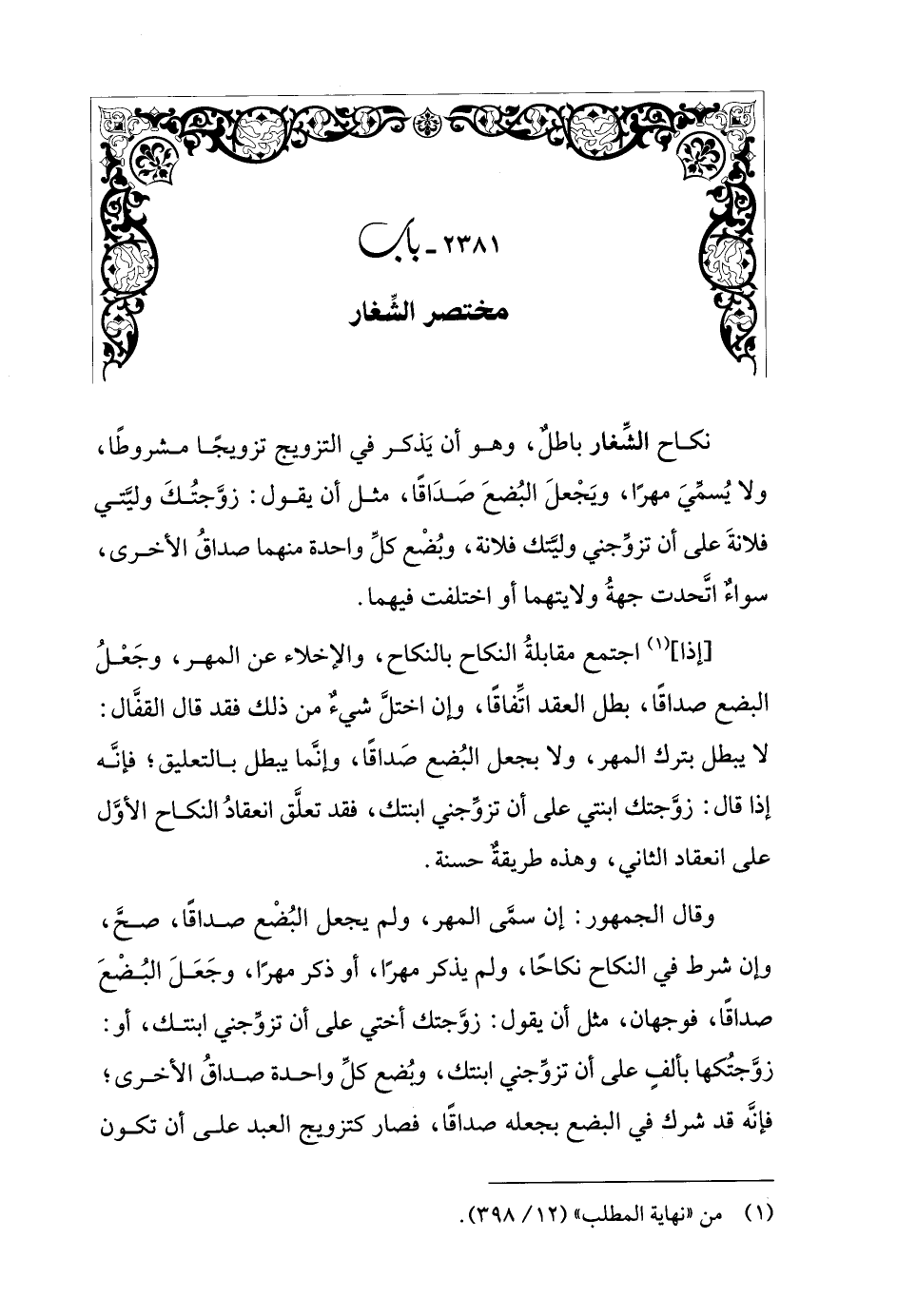 نكاح الشِّغار باطلٌ، وهو أن يَذكر في التزويج تزويجًا مشروطًا، ولا يُسمِّيَ مهرًا، ويَجْعلَ البُضعَ صَدَاقًا، مثل أن يقول: زوَّجتُكَ وليَّتي فلانةَ على أن تزوّجني وليَّتك فلانة، وبُضْع كلِّ واحدة منهما صداقُ الأخرى، سواءٌ اتَّحدت جهةُ ولايتهما أو اختلفت فيهما.