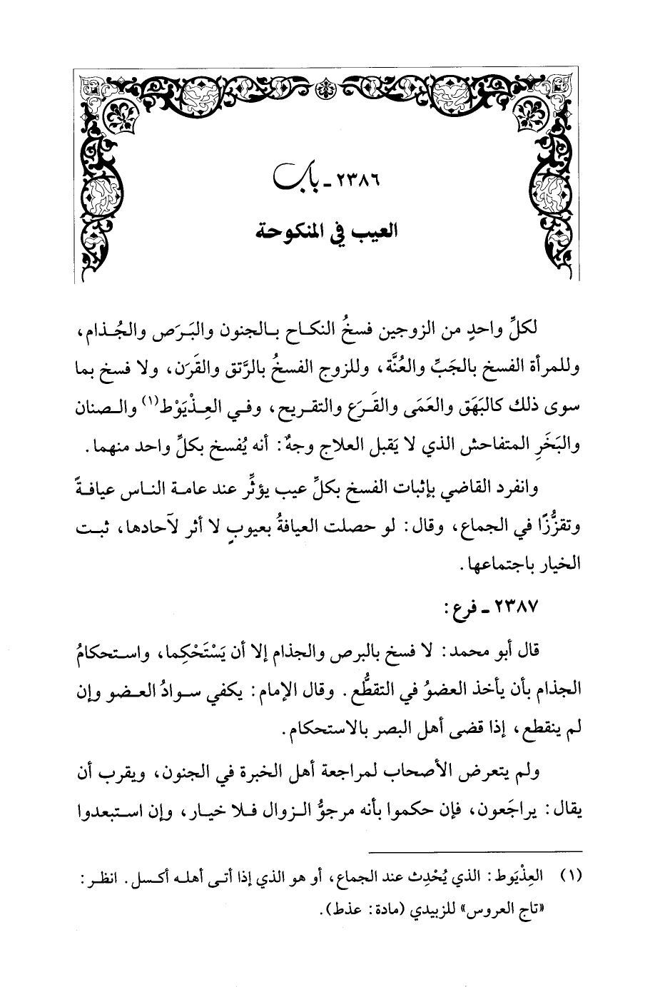 لكلِّ واحدٍ من الزوجين فسخُ النكاح بالجنون والبَرَص والجُذام، وللمرأة الفسخ بالجَبِّ والعُنَّة، وللزوج الفسخُ بالرَّتق والقَرَن، ولا فسخ بما سوى ذلك كالبَهَق والعَمَى والقَرَع والتقريح، وفي العِذْيَوْط (¬1) والصنان والبَخَرِ المتفاحش الذي لا يَقبل العلاج وجهٌ: أنه يُفسخ بكلِّ واحد منهما.
