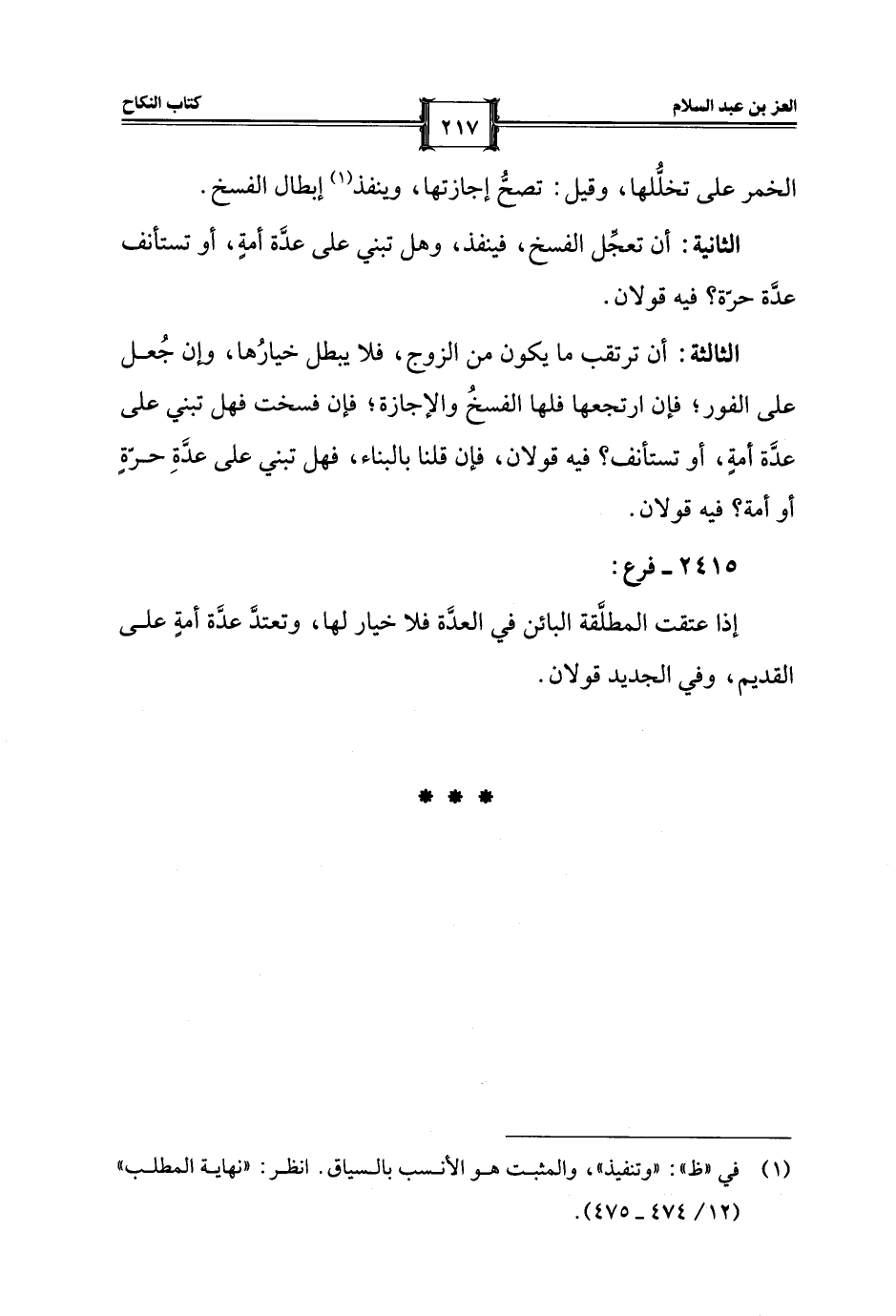 الثالثة: أن ترتقب ما يكون من الزوج، فلا يبطل خيارُها، وإن جُعل على الفور؛ فإن ارتجعها فلها الفسخُ والإجازة؛ فإن فسخت فهل تبني على عدَّة أمةٍ، أو تستأنف؟ فيه قولان، فإن قلنا بالبناء، فهل تبني على عدَّةِ حرّةٍ أو أمة؟ فيه قولان.