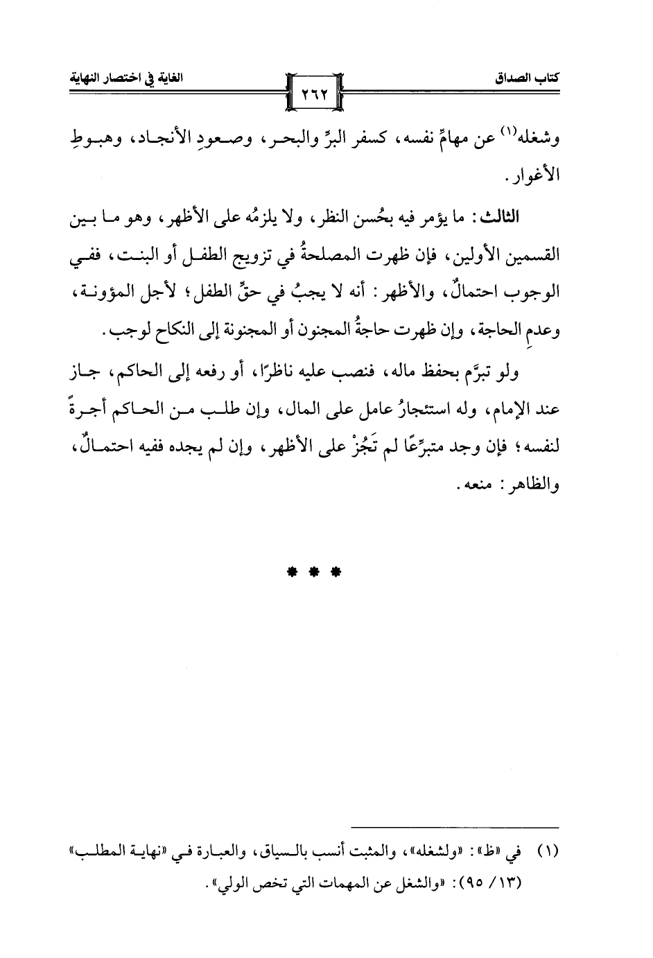 (¬1) في "ظ": "ولشغله"، والمثبت أنسب بالسياق، والعبارة في "نهاية المطلب" (13/ 95): "والشغل عن المهمات التي تخص الولي".