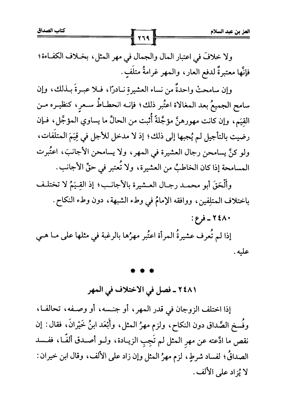 وإن سامحتْ واحدةٌ من نساء العشيرةِ نادرًا، فلا عبرةَ بذلك، وإن سامح الجميعُ بعد المغالاة اعتُبر ذلك؛ فإنه انحطاطُ سعرٍ، كنظيره من القِيَم، وإن كانت مهورهنَّ مؤجَّلةً أُثبت من الحالِّ ما يساوي المؤجَّل، فإن رضيت بالتأجيل لم يُجبها إلى ذلك؛ إذ لا مدخل للأجل في قِيَم المتلَفات، ولو كنَّ يسامحن رجال العشيرة في المهر، ولا يسامحن الأجانبَ، اعتُبرت المسامحة إذا كان الخاطبُ من العشيرة، ولا تُعتبر في حقِّ الأجانب.