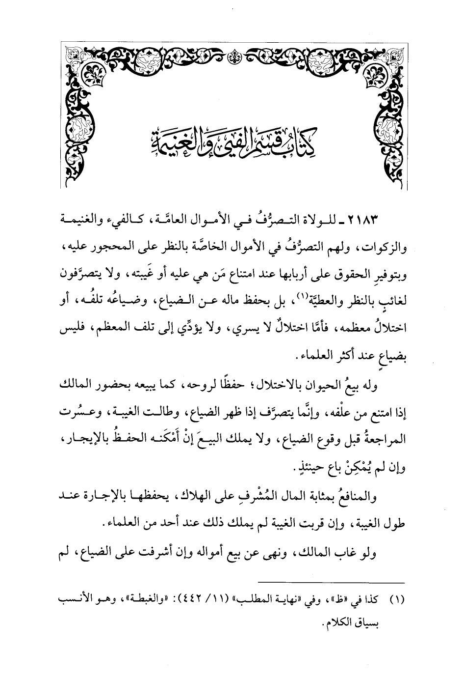 2183 - للولاة التصرُّفُ في الأموال العامَّة، كالفيء والغنيمة والزكوات، ولهم التصرُّفُ في الأموال الخاصَّة بالنظر على المحجور عليه، وبتوفيرِ الحقوق على أربابها عند امتناع مَن هي عليه أو غَيبته، ولا يتصرَّفون لغائبٍ بالنظر والعطيَّة (¬1)، بل بحفظ ماله عن الضياع، وضياعُه تلفُه، أو اختلالُ معظمه، فأمَّا اختلالٌ لا يسري، ولا يؤدِّي إلى تلف المعظم، فليس بضياعٍ عند أكثر العلماء.