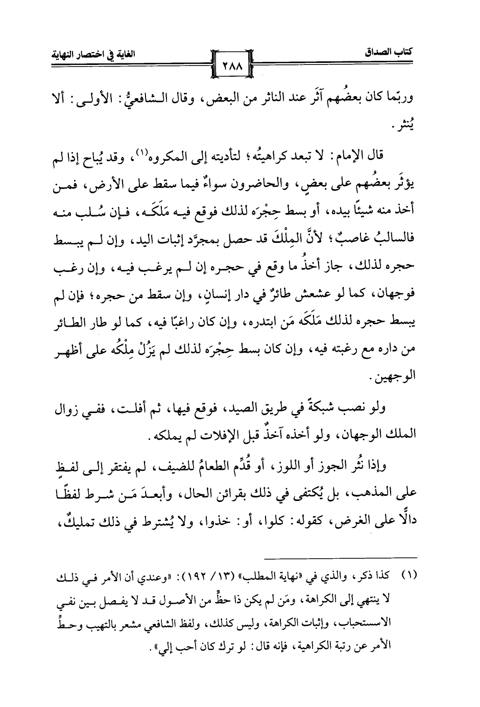(¬1) كذا ذكر، والذي في "نهاية المطلب" (13/ 192): "وعندي أن الأمر في ذلك لا ينتهي إلى الكراهة، ومَن لم يكن ذا حط من الأصول قد لا يفصل بين نفي الاستحباب، وإثبات الكراهة، وليس كذلك، ولفظ الشافعي مشعر بالتهيب وحطِّ الأمر عن رتبة الكراهية، فإنه قال: لو ترك كان أحب إلي".