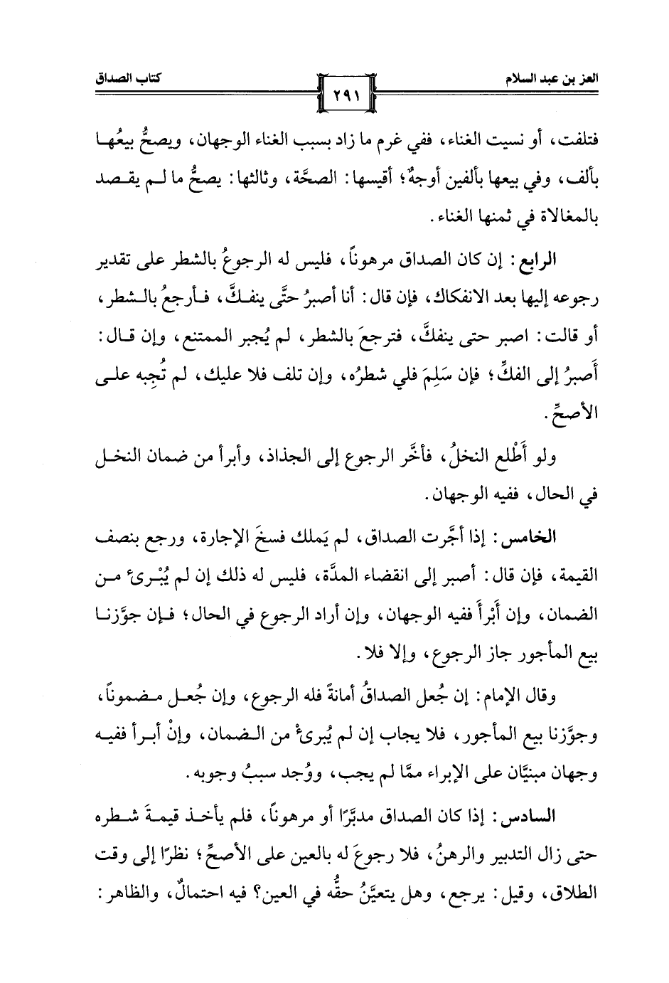 الرابع: إن كان الصداق مرهونًا، فليس له الرجوعُ بالشطر على تقدير رجوعه إليها بعد الانفكاك، فإن قال: أنا أصبرُ حتَّى ينفكَّ، فأرجعُ بالشطر، أو قالت: اصبر حتى ينفكَّ، فترجعَ بالشطر، لم يُجبر الممتنع، وإن قال: أَصبرُ إلى الفكِّ؛ فإن سَلِمَ فلي شطرُه، وإن تلف فلا عليك، لم تُجِبه على الأصحِّ.