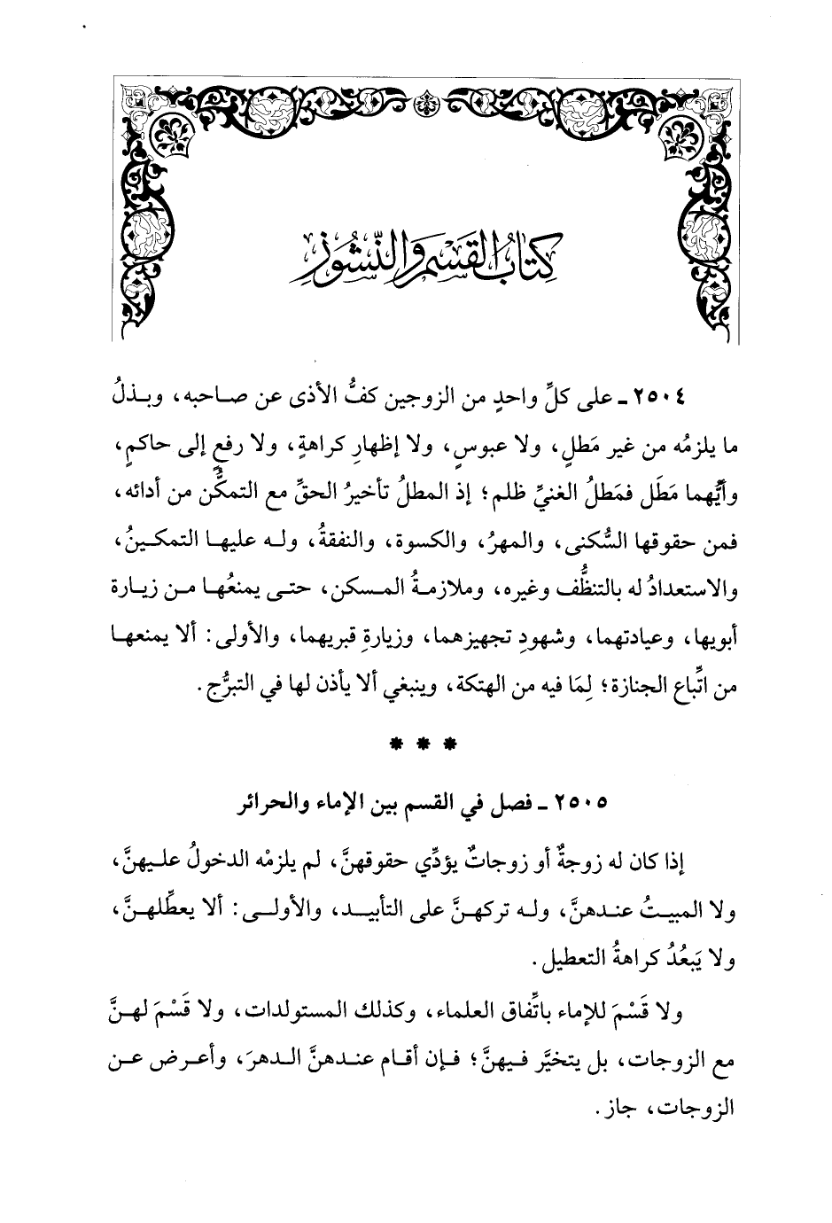 2504 - على كلِّ واحدٍ من الزوجين كفُّ الأذى عن صاحبه، وبذلُ ما يلزمُه من غير مَطلٍ، ولا عبوسٍ، ولا إظهارِ كراهةٍ، ولا رفع إلى حاكمٍ، وأيُّهما مَطَل فمَطلُ الغنيِّ ظلم؛ إذ المطلُ تأخيرُ الحقِّ مع التمكُّن من أدائه، فمن حقوقها السُّكنى، والمهرُ، والكسوة، والنفقةُ، وله عليها التمكينُ، والاستعدادُ له بالتنظُّف وغيره، وملازمةُ المسكن، حتى يمنعُها من زيارة أبويها، وعيادتهما، وشهودِ تجهيزهما، وزيارةِ قبريهما، والأولى: ألا يمنعها من اتِّباع الجنازة؛ لِمَا فيه من الهتكة، وينبغي ألا يأذن لها في التبرُّج.