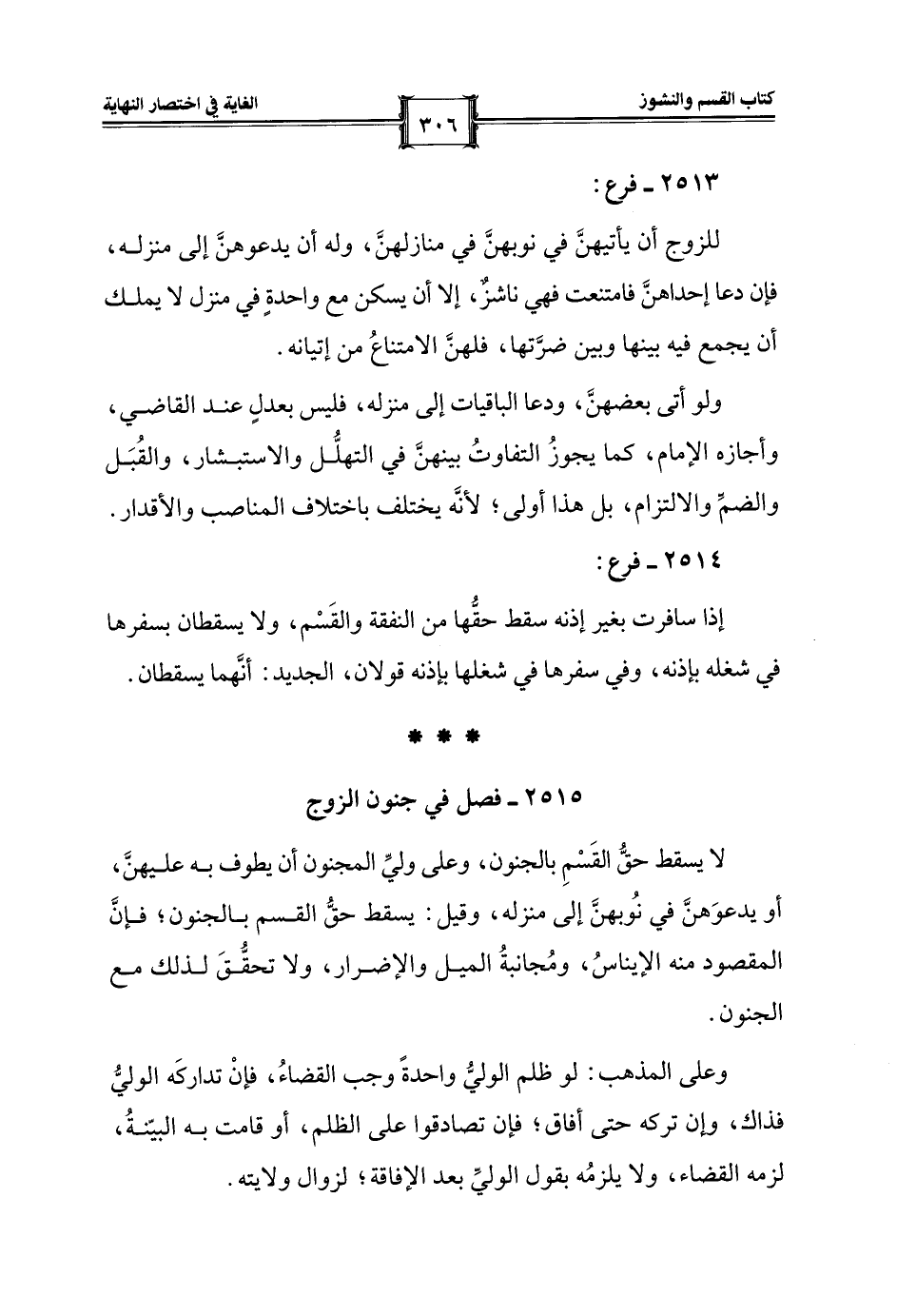 للزوج أن يأتيهنَّ في نوبهنَّ في منازلهنَّ، وله أن يدعوهنَّ إلى منزله، فإن دعا إحداهنَّ فامتنعت فهي ناشزٌ، إلا أن يسكن مع واحدةٍ في منزل لا يملك أن يجمع فيه بينها وبين ضرَّتها، فلهنَّ الامتناعُ من إتيانه.