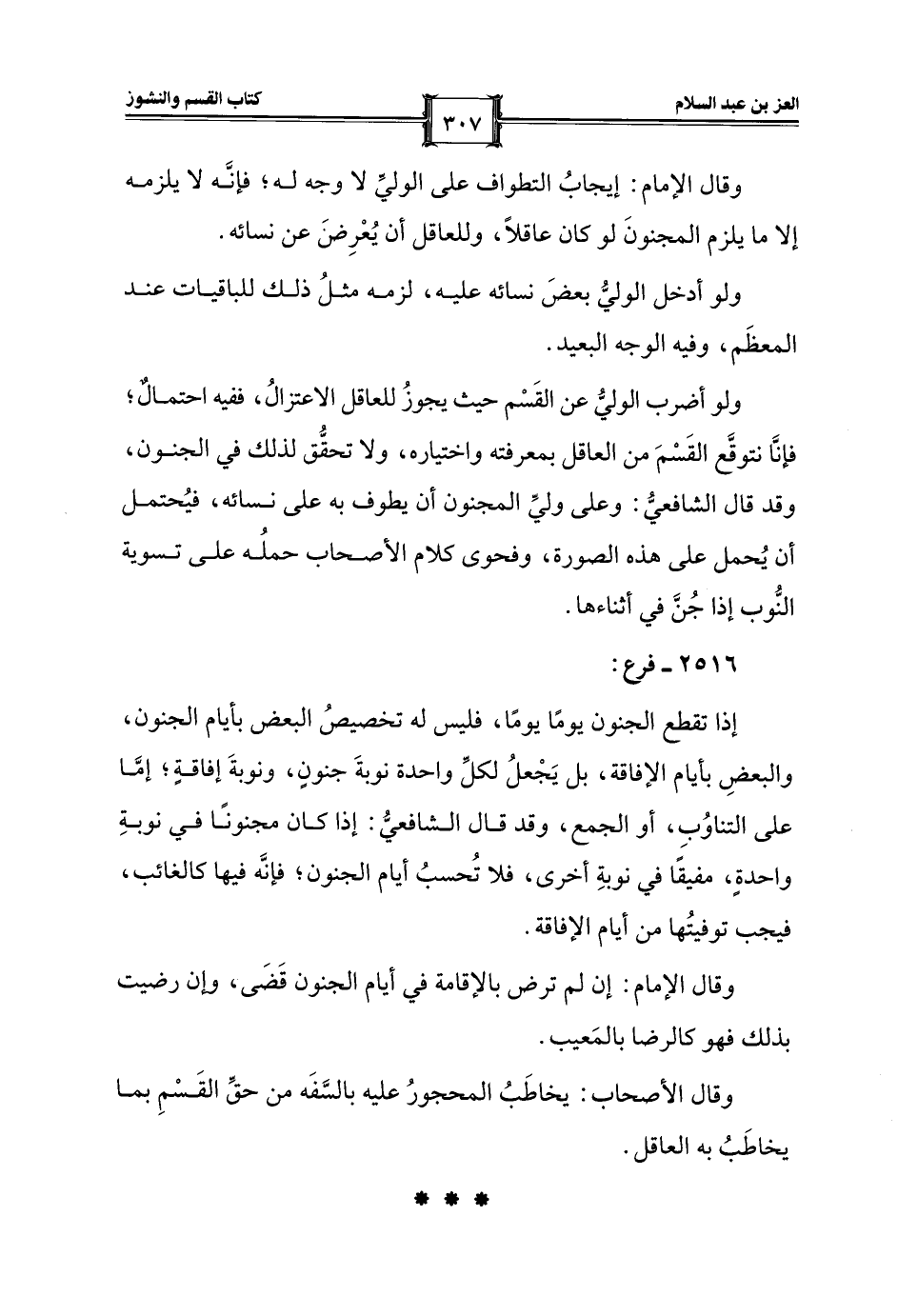 ولو أضرب الوليُّ عن القَسْم حيث يجوزُ للعاقل الاعتزالُ، ففيه احتمالٌ؛ فإنَّا نتوقَّع القَسْمَ من العاقل بمعرفته واختياره، ولا تحقُّق لذلك في الجنون، وقد قال الشافعيُّ: وعلى وليِّ المجنون أن يطوف به على نسائه، فيُحتمل أن يُحمل على هذه الصورة، وفحوى كلام الأصحاب حملُه على تسوية النُّوب إذا جُنَّ في أثناءها.