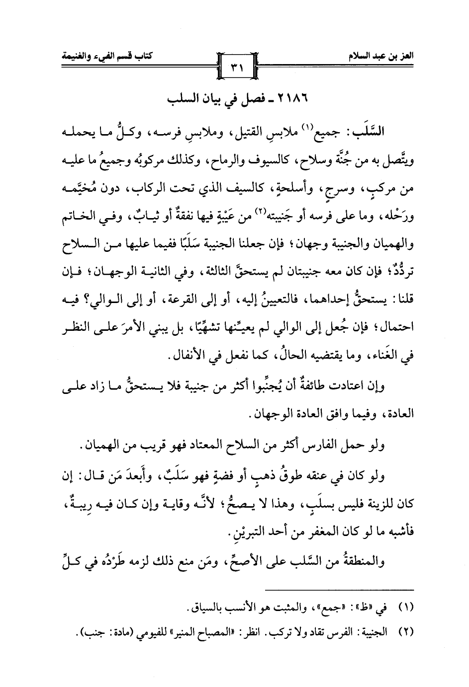 السَّلَب: جميع (¬1) ملابسِ القتيل، وملابسِ فرسه، وكلُّ ما يحمله ويتَّصل به من جُنَّة وسلاح، كالسيوف والرماح، وكذلك مركوبُه وجميعُ ما عليه من مركب، وسرجٍ، وأسلحةٍ، كالسيف الذي تحت الركاب، دون مُخيَّمه ورَحْله، وما على فرسه أو جَنيبته (¬2) من عَيْبةٍ فيها نفقةٌ أو ثيابٌ، وفي الخاتم والهميان والجنيبة وجهان؛ فإن جعلنا الجنيبة سَلَبًا ففيما عليها من السلاح تردُّدٌ؛ فإن كان معه جنيبتان لم يستحقَّ الثالثة، وفي الثانية الوجهان؛ فإن قلنا: يستحقُّ إحداهما، فالتعيينُ إليه، أو إلى القرعة، أو إلى الوالي؟ فيه احتمال؛ فإن جُعل إلى الوالي لم يعيِّنها تشهِّيًا، بل يبني الأمرَ على النظر في الغَناء، وما يقتضيه الحالُ، كما نفعل في الأنفال.