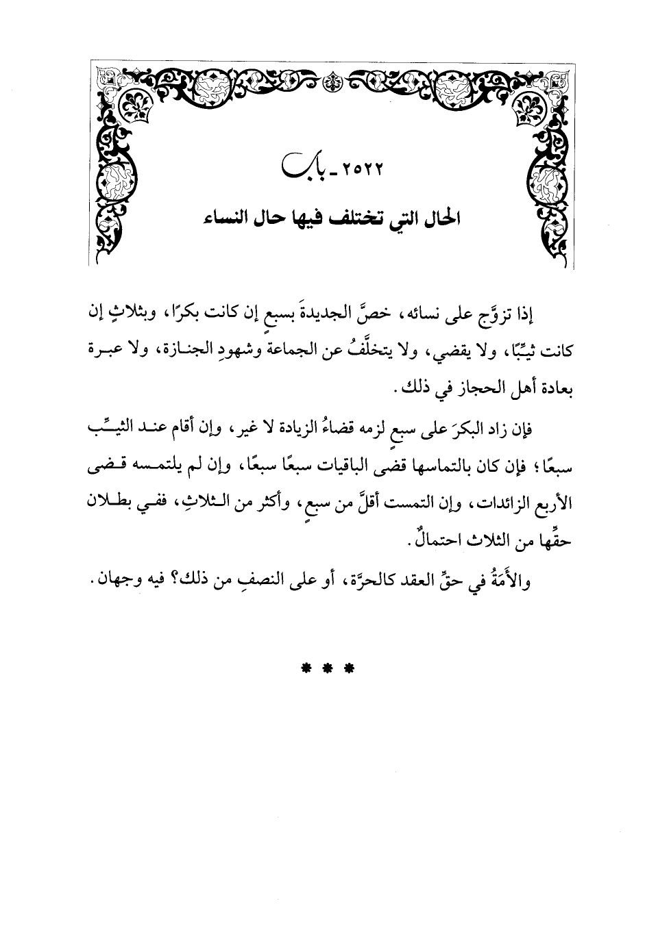 إذا تزوَّج على نسائه، خصَّ الجديدةَ بسبعٍ إن كانت بكرًا، وبثلاثٍ إن كانت ثيِّبًا، ولا يقضي، ولا يتخلَّفُ عن الجماعة وشهودِ الجنازة، ولا عبرة بعادة أهل الحجاز في ذلك.