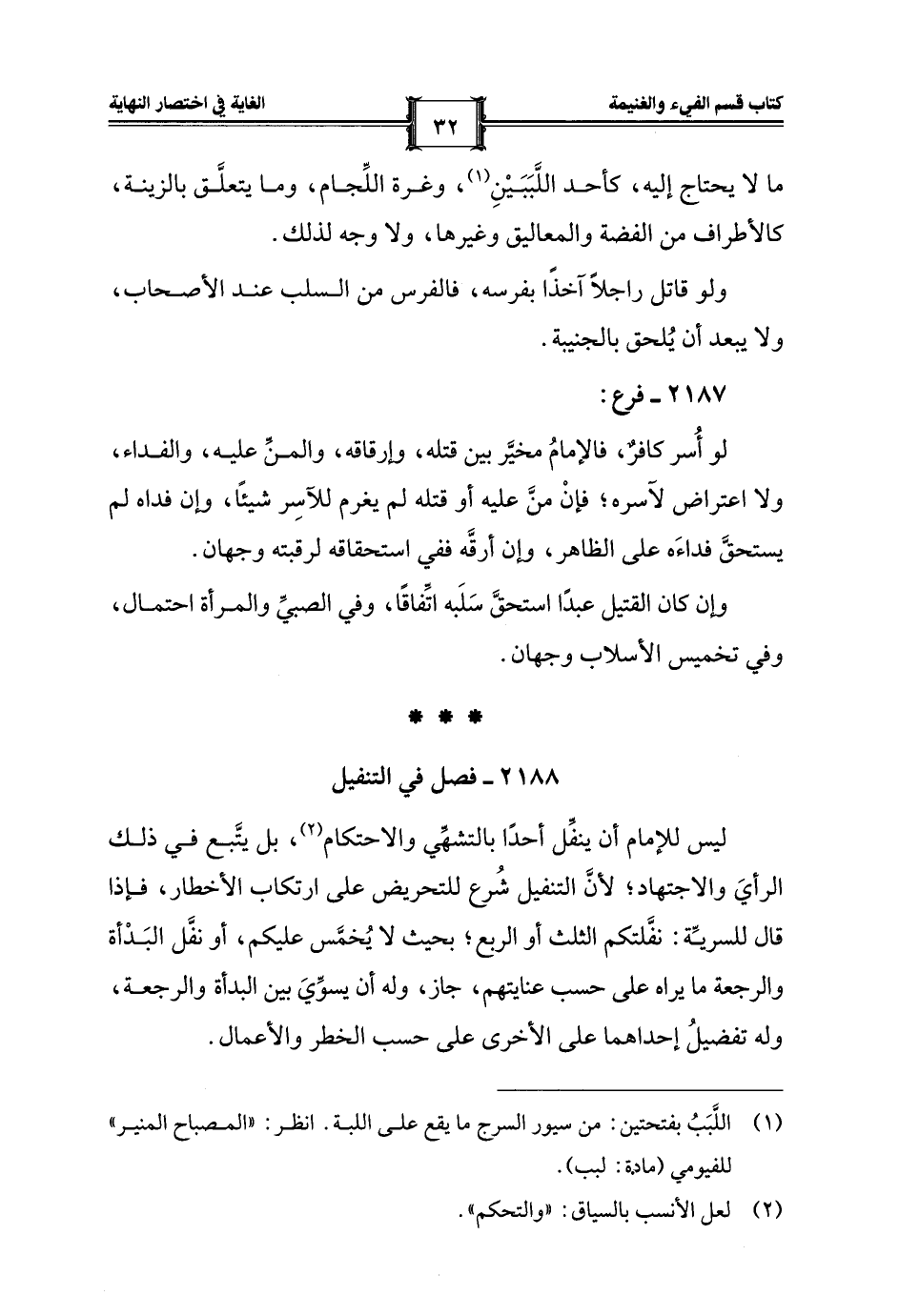 ليس للإمام أن ينفِّل أحدًا بالتشهِّي والاحتكام (¬2)، بل يتَّبع في ذلك الرأيَ والاجتهاد؛ لأنَّ التنفيل شُرع للتحريض على ارتكاب الأخطار، فإذا قال للسريِّة: نفَّلتكم الثلث أو الربع؛ بحيث لا يُخمَّس عليكم، أو نفَّل البَدْأة والرجعة ما يراه على حسب عنايتهم، جاز، وله أن يسوِّيَ بين البدأة والرجعة، وله تفضيلُ إحداهما على الأخرى على حسب الخطر والأعمال.
