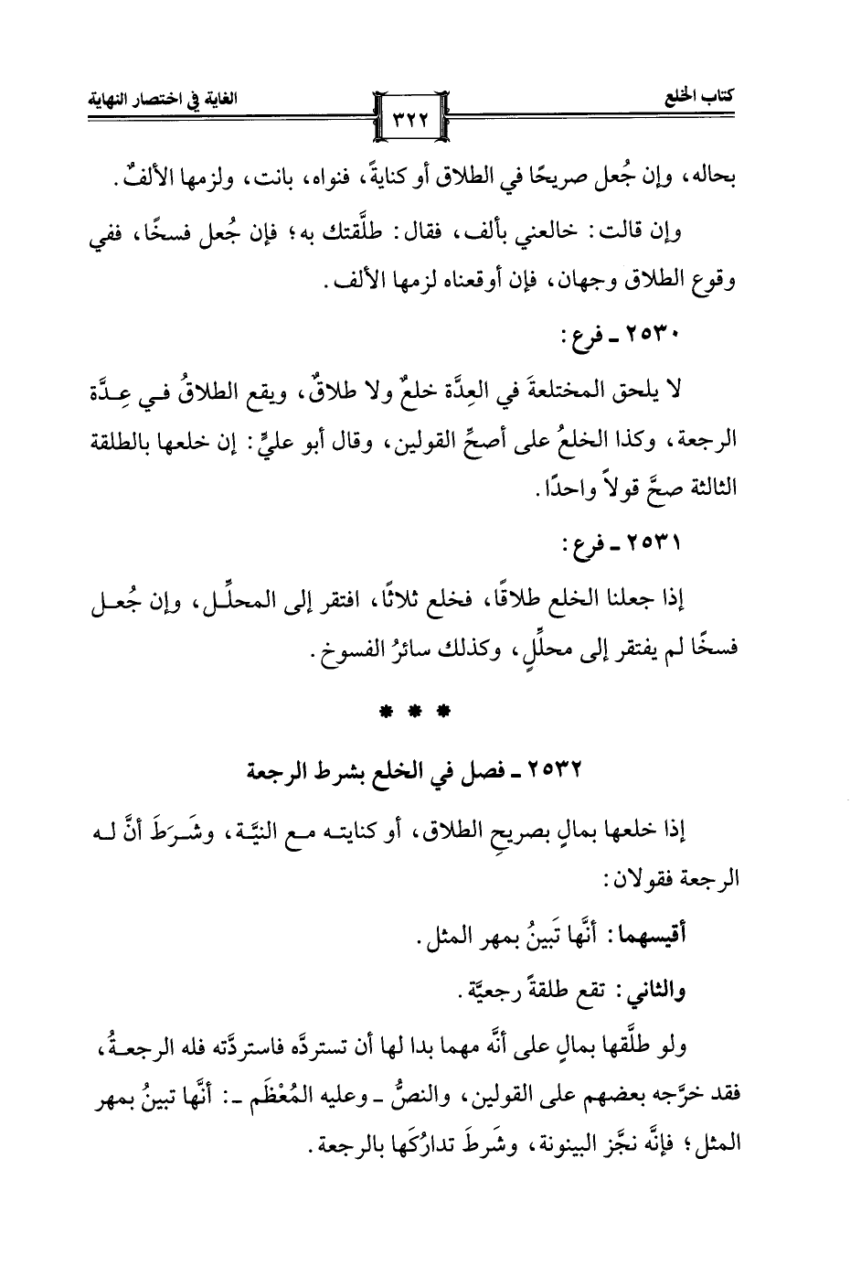 إذا خلعها بمالٍ بصريحِ الطلاق، أو كنايته مع النيَّة، وشَرَطَ أنَّ له الرجعة فقولان: