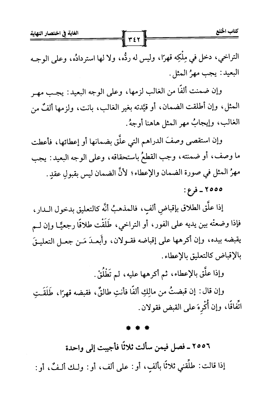 التراخي، دخل في مِلْكِه قهرًا، وليس له ردُّه، ولا لها استردادُه، وعلى الوجه البعيد: يجب مهرُ المثل.