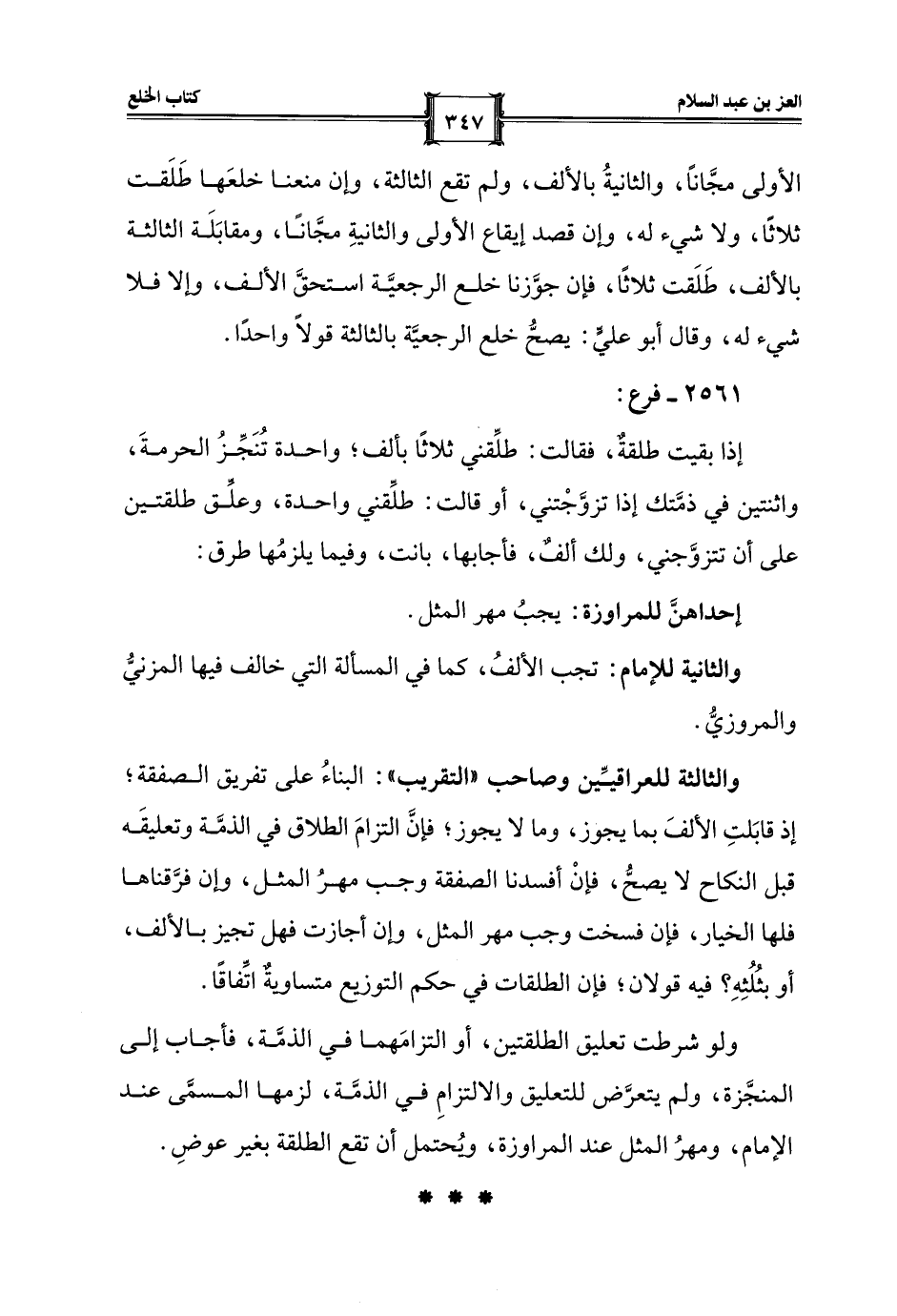 والثالثة للعراقيِّين وصاحب "التقريب": البناءُ على تفريق الصفقة؛ إذ قابَلتِ الألفَ بما يجوز، وما لا يجوز؛ فإنَّ التزامَ الطلاق في الذمَّة وتعليقَه قبل النكاح لا يصحُّ، فإنْ أفسدنا الصفقة وجب مهرُ المثل، وإن فرَّقناها فلها الخيار، فإن فسخت وجب مهر المثل، وإن أجازت فهل تجيز بالألف، أو بثُلُثِهِ؛ فيه قولان؛ فإن الطلقات في حكم التوزيع متساويةٌ اتِّفاقًا.
