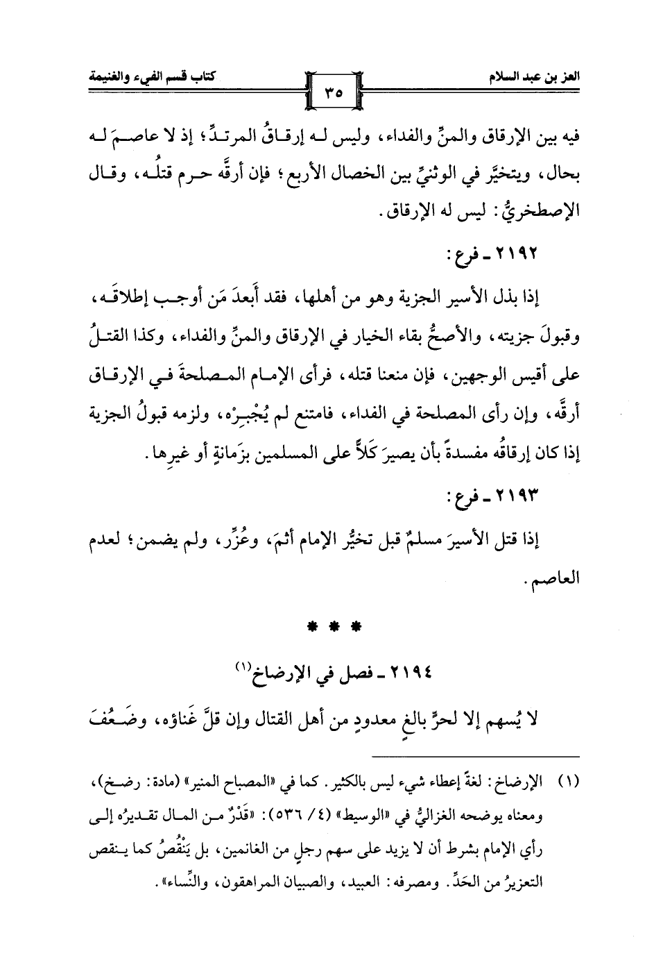 (¬1) الإرضاخ: لغةً إعطاء شيء ليس بالكثير. كما في "المصباح المنير" (مادة: رضخ)، ومعناه يوضحه الغزاليُّ في "الوسيط" (4/ 536): "قَدْرٌ من المال تقديرُه إلى رأي الإمام بشرط أن لا يزيد على سهم رجلٍ من الغانمين، بل يَنْقُصُ كما ينقص التعزيرُ من الحَدِّ. ومصرفه: العبيد، والصبيان المراهقون، والنِّساء".