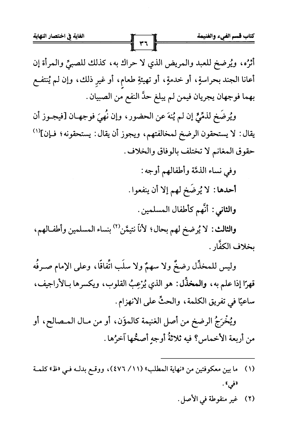أثرُه، ويُرضخ للعبد والمريض الذي لا حراك به، كذلك للصبيِّ والمرأة إن أعانا الجند بحراسةٍ، أو خدمةٍ، أو تهيئةِ طعامٍ، أو غيرِ ذلك، وإن لم يُنتفع بهما فوجهان يجريان فيمن لم يبلغ حدَّ النفع من الصبيان.