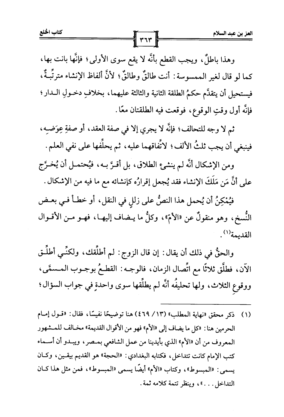 (¬1) ذكر محقق "نهاية المطلب" (13/ 469) هنا توضيحًا نفيسًا، فقال: "قول إمام الحرمين هنا: "كل ما يضاف إلى "الأم" فهو من الأقوال القديمة" مخالف للمشهور المعروف من أن "الأم" الذي بأيدينا من عمل الشافعي بمصر، ويبدو أن أسماء كتب الإمام كانت تتداخل، فكتابه البغدادي: "الحجة" هو القديم بيقين، وكان يسمى: "المبسوط"، وكتاب "الأم" أيضًا يسمى "المبسوط"، فمن مثل هذا كان التداخل ... "، وينظر تتمة كلامه ثمة.