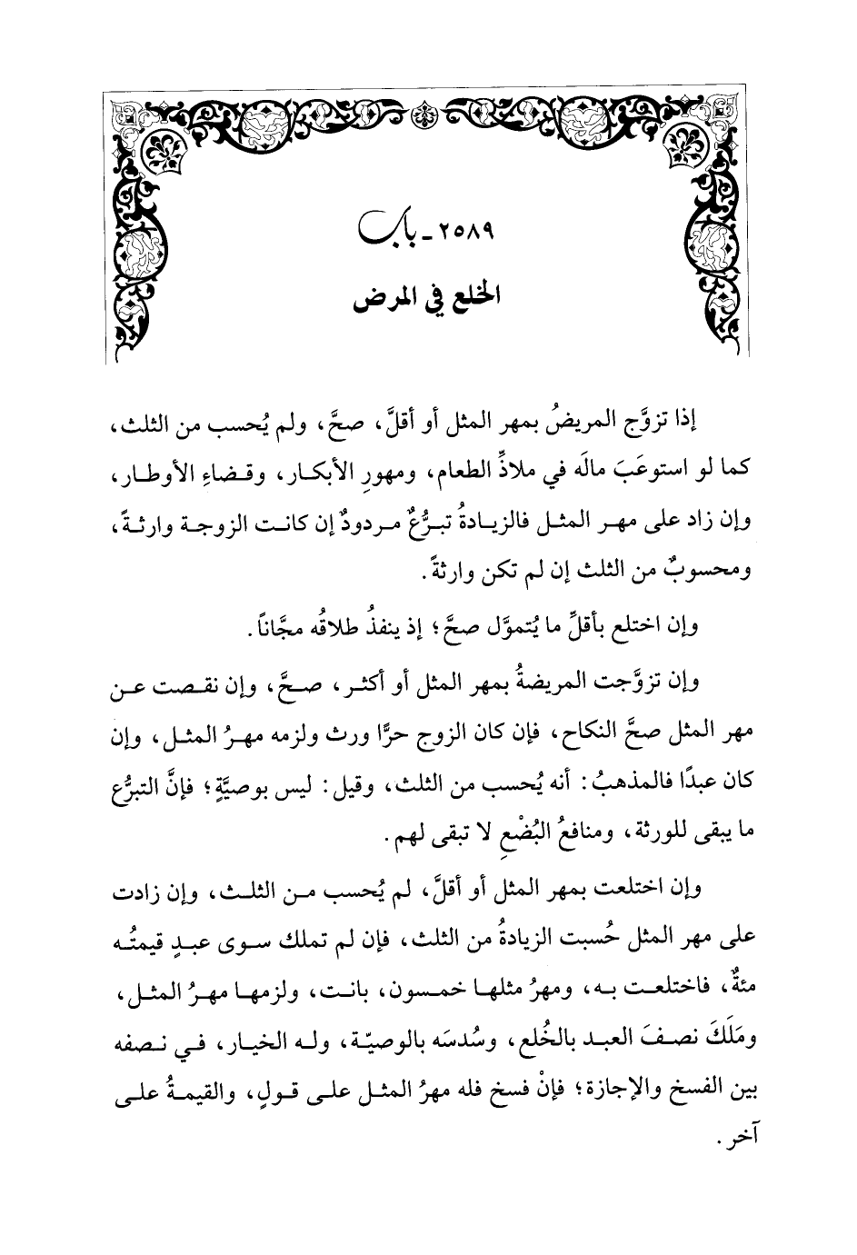 إذا تزوَّج المريضُ بمهر المثل أو أقلَّ، صحَّ، ولم يُحسب من الثلث، كما لو استوعَبَ مالَه في ملاذِّ الطعام، ومهورِ الأبكار، وقضاءِ الأوطار، وإن زاد على مهر المثل فالزيادةُ تبرُّعٌ مردودٌ إن كانت الزوجة وارثةً، ومحسوبٌ من الثلث إن لم تكن وارثةً.