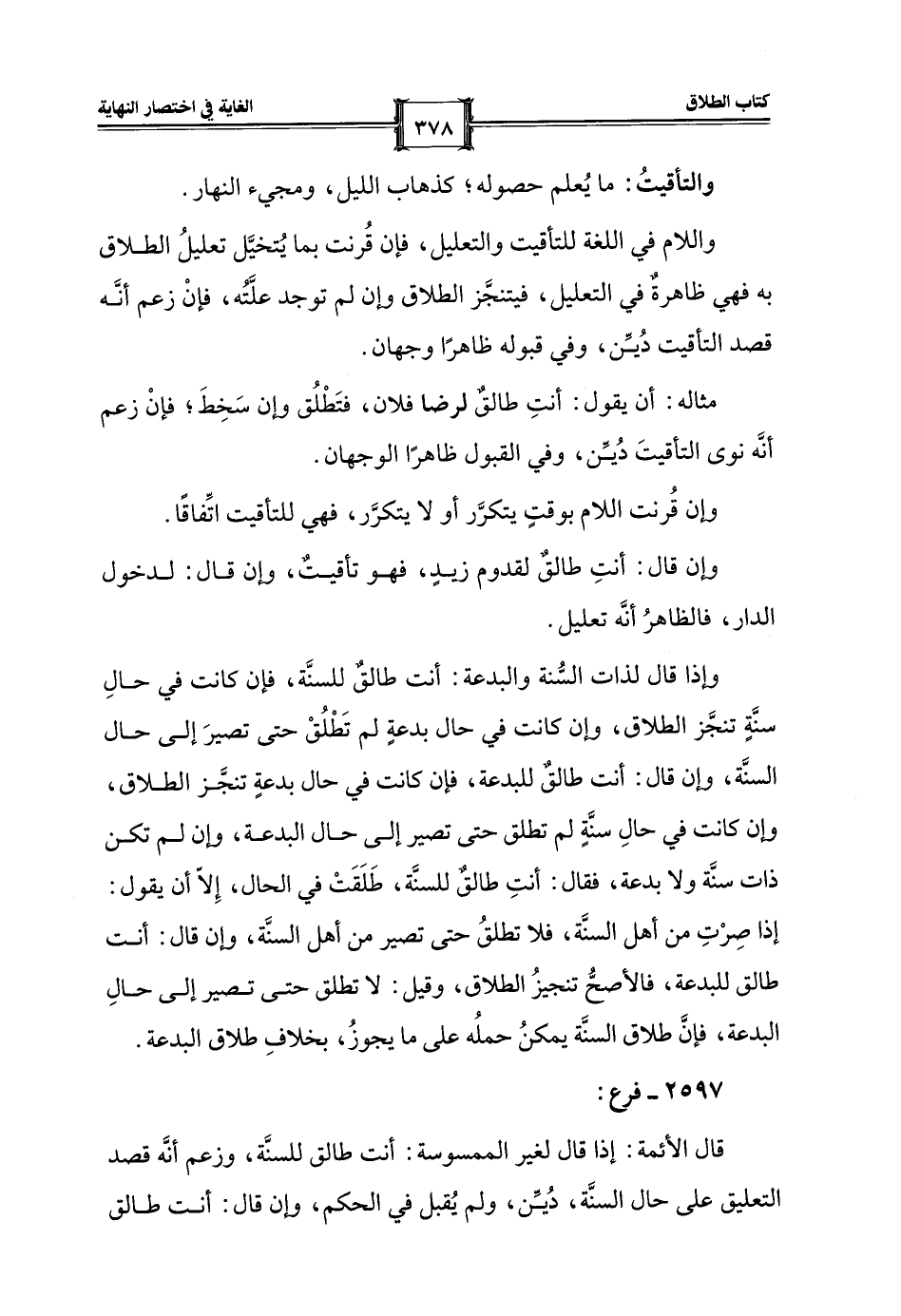 وإذا قال لذات السُّنة والبدعة: أنت طالقٌ للسنَّة، فإن كانت في حالِ سنَّةٍ تنجَّز الطلاق، وإن كانت في حال بدعةٍ لم تَطْلُقْ حتى تصيرَ إلى حال السنَّة، وإن قال: أنت طالقٌ للبدعة، فإن كانت في حال بدعةٍ تنجَّز الطلاق، وإن كانت في حالِ سنَّةٍ لم تطلق حتى تصير إلى حال البدعة، وإن لم تكن ذات سنَّة ولا بدعة، فقال: أنتِ طالقٌ للسنَّة، طَلَقَتْ في الحال، إِلّا أن يقول: إذا صِرْتِ من أهل السنَّة، فلا تطلقُ حتى تصير من أهل السنَّة، وإن قال: أنت طالق للبدعة، فالأصحُّ تنجيزُ الطلاق، وقيل: لا تطلق حتى تصير إلى حالِ البدعة، فإنَّ طلاق السنَّة يمكنُ حملُه على ما يجوزُ، بخلافِ طلاق البدعة.