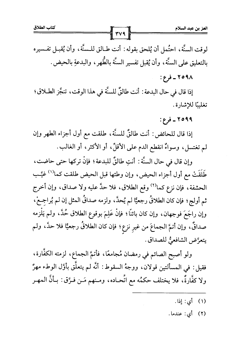 إذا قال في حال البدعة: أنت طالقٌ للسنَّة في هذا الوقت، تنجَّز الطلاق؛ تغليبًا للإشارة.