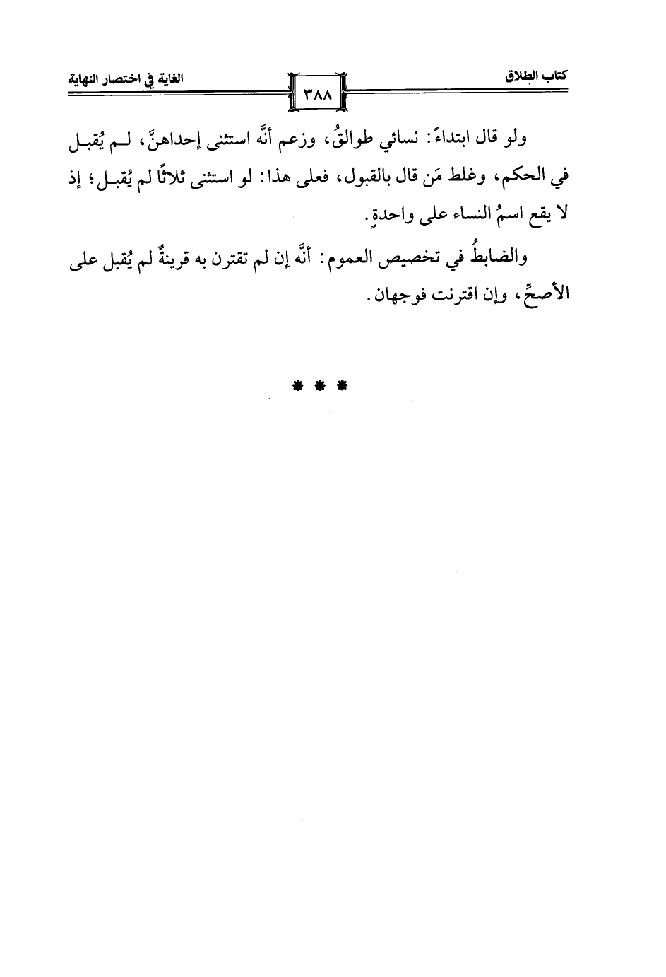 ولو قال ابتداءً: نسائي طوالقُ، وزعم أنَّه استثنى إحداهنَّ، لم يُقبل في الحكم، وغلط مَن قال بالقبول، فعلى هذا: لو استثنى ثلاثًا لم يُقبل؛ إذ لا يقع اسمُ النساء على واحدةٍ.