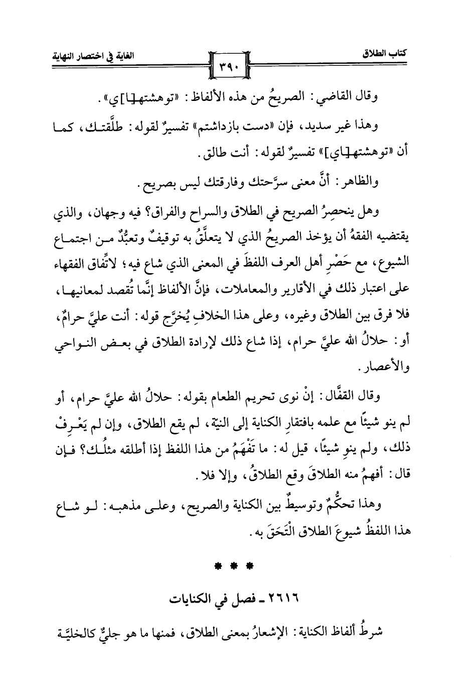 وهل ينحصِرُ الصريح في الطلاق والسراح والفراق؟ فيه وجهان، والذي يقتضيه الفقهُ أن يؤخذ الصريحُ الذي لا يتعلَّقُ به توقيفٌ وتعبُّدٌ من اجتماع الشيوع، مع حَصْرِ أهل العرف اللفظَ في المعنى الذي شاع فيه؛ لاتِّفاق الفقهاء على اعتبار ذلك في الأقارير والمعاملات، فإنَّ الألفاظ إنَّما تُقصد لمعانيها، فلا فرق بين الطلاق وغيره، وعلى هذا الخلافِ يُخرَّج قوله: أنت عليَّ حرامٌ، أو: حلالُ الله عليَّ حرام، إذا شاع ذلك لإرادة الطلاق في بعض النواحي والأعصار.