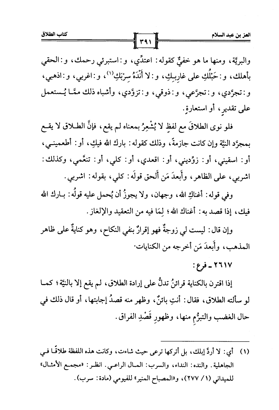 والبريَّة، ومنها ما هو خفيٌّ كقوله: اعتدِّي، و: استبرئي رحمك، و: الحقي بأهلك، و: حَبْلُكِ على غارِبِكِ، و: لا أَنْدَهُ سِرْبَكِ (¬1)، و: اغربي، و: اذهبي، و: تجرَّدي، و: تجرَّعي، و: ذوقي، و: تزوَّدي، وأشباه ذلك ممَّا يُستعمل على تقديرٍ، أو استعارةٍ.