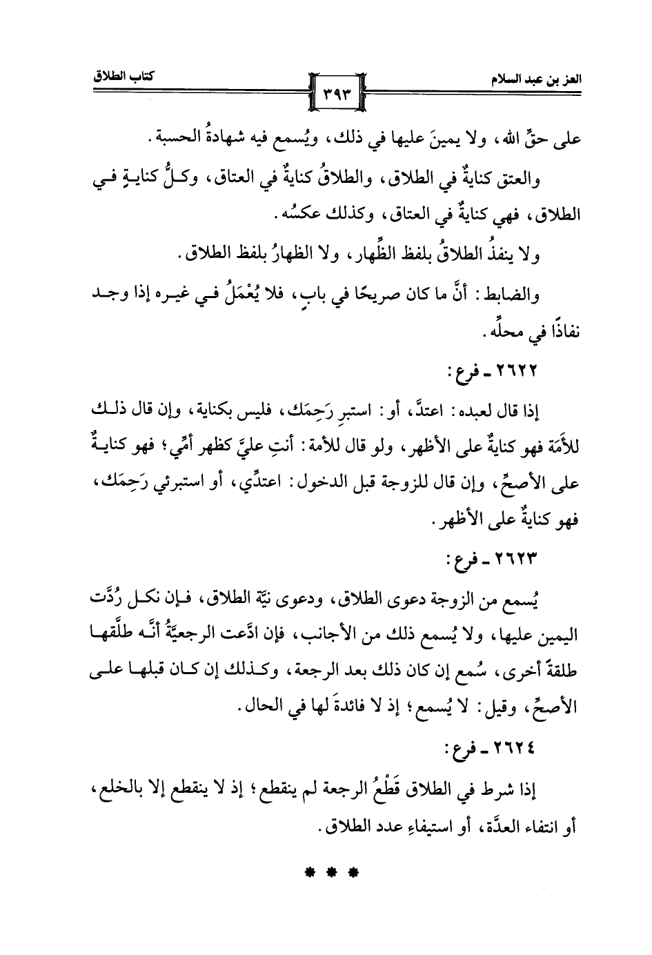 إذا قال لعبده: اعتدَّ، أو: استبرِ رَحِمَك، فليس بكناية، وإن قال ذلك للأَمَة فهو كنايةٌ على الأظهر، ولو قال للأمة: أنتِ عليَّ كظهر أمِّي؛ فهو كنايةٌ على الأصحِّ، وإن قال للزوجة قبل الدخول: اعتدِّي، أو استبرئي رَحِمَك، فهو كنايةٌ على الأظهر.