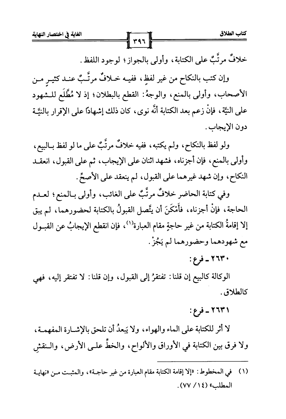 (¬1) في المخطوط: "إلا إقامة الكتابة مقام العبارة من غير حاجة"، والمثبت من "نهاية المطلب" (14/ 77).