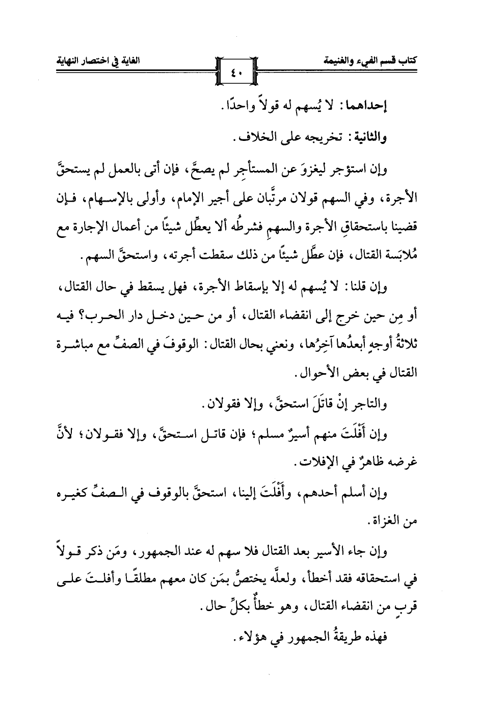 وإن قلنا: لا يُسهم له إلا بإسقاط الأجرة، فهل يسقط في حال القتال، أو مِن حين خرج إلى انقضاء القتال، أو من حين دخل دار الحرب؟ فيه ثلاثةُ أوجهٍ أبعدُها آخِرُها، ونعني بحال القتال: الوقوفَ في الصفِّ مع مباشرة القتال في بعض الأحوال.