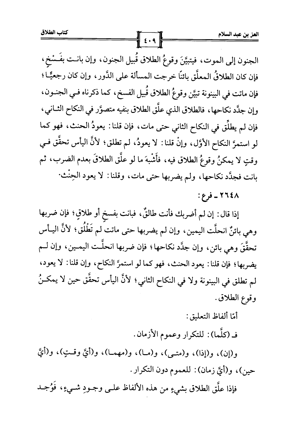 الجنون إلى الموت، فيتبيَّنَ وقوعُ الطلاق قُبيل الجنون، وإن بانت بفَسْخٍ، فإن كان الطلاقُ المعلَّق بائنًا خرجت المسألة على الدَّور، وإن كان رجعيًّا؛ فإن ماتت في البينونة تبيَّن وقوعُ الطلاق قُبيل الفسخ، كما ذكرناه في الجنون، وإن جدَّد نكاحها، فالطلاق الذي علَّق الطلاق بنفيه متصوَّر في النكاح الثاني، فإن لم يطلِّق في النكاح الثاني حتى مات، فإن قلنا: يعودُ الحنث، فهو كما لو استمرَّ النكاح الأوَّل، وإنْ قلنا: لا يعودُ، لم تطلق؛ لأنَّ اليأس تحقَّق في وقتٍ لا يمكنُ وقوعُ الطلاق فيه، فأَشْبهَ ما لو علَّق الطلاقَ بعدم الضرب، ثم بانت فجدَّد نكاحها، ولم يضربها حتى مات، وقلنا: لا يعود الحِنْثْ