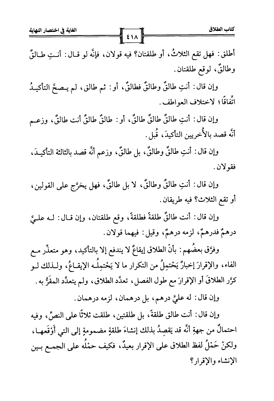 وفرَّق بعضُهم: بأنّ الطلاق إيقاعٌ لا يندفع إلا بالتأكيد، وهو متعذِّر مع الفاء، والإقرارَ إخبارٌ يَحْتمِلُ من التكرار ما لا يَحْتمِلُه الإيقاعُ، ولذلك لو كرَّر الطلاقَ أو الإقرارَ مع طول الفصل، تعدَّد الطلاق، ولم يتعدَّد المقَرُّ به.