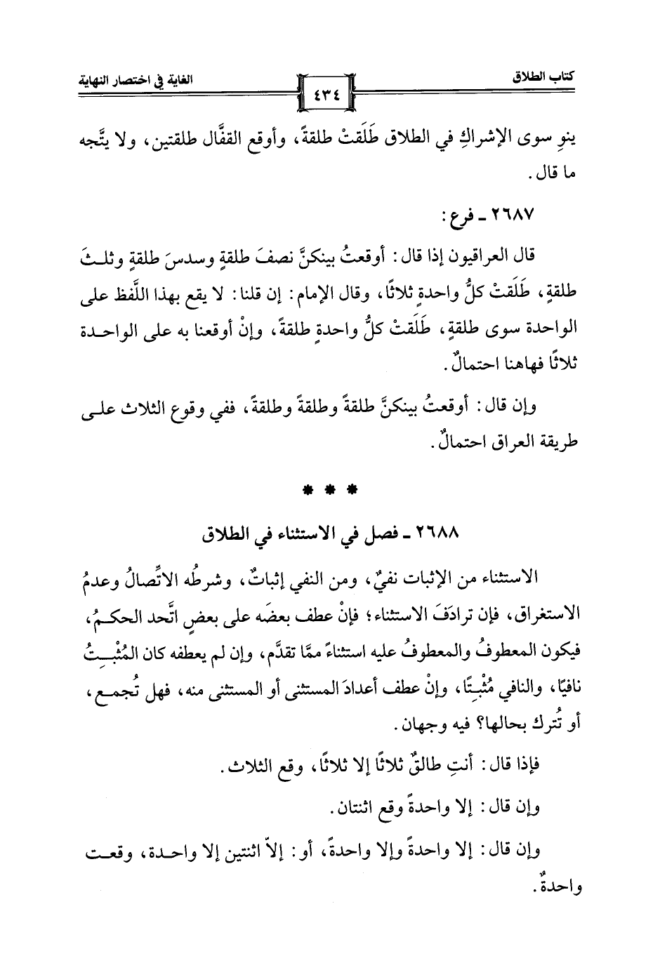 فإذا قال: أنتِ طالقٌ ثلاثًا إلا ثلاثًا، وقع الثلاث.
