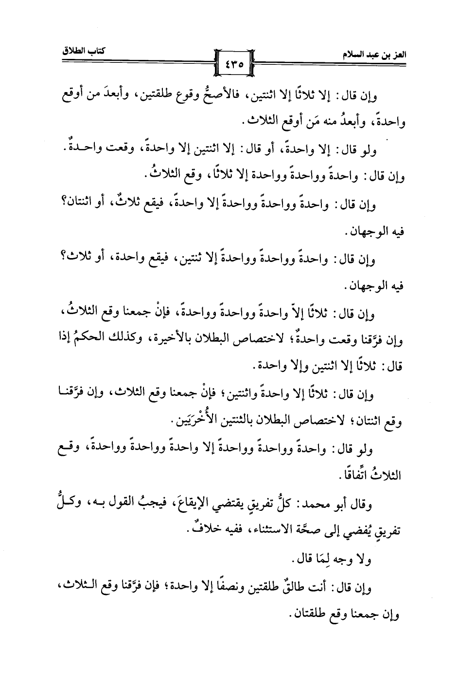 وقال أبو محمد: كلُّ تفريقٍ يقتضي الإيقاعَ، فيجبُ القول به، وكلُّ تفريقٍ يُفضي إلى صحَّة الاستثناء، ففيه خلافٌ.